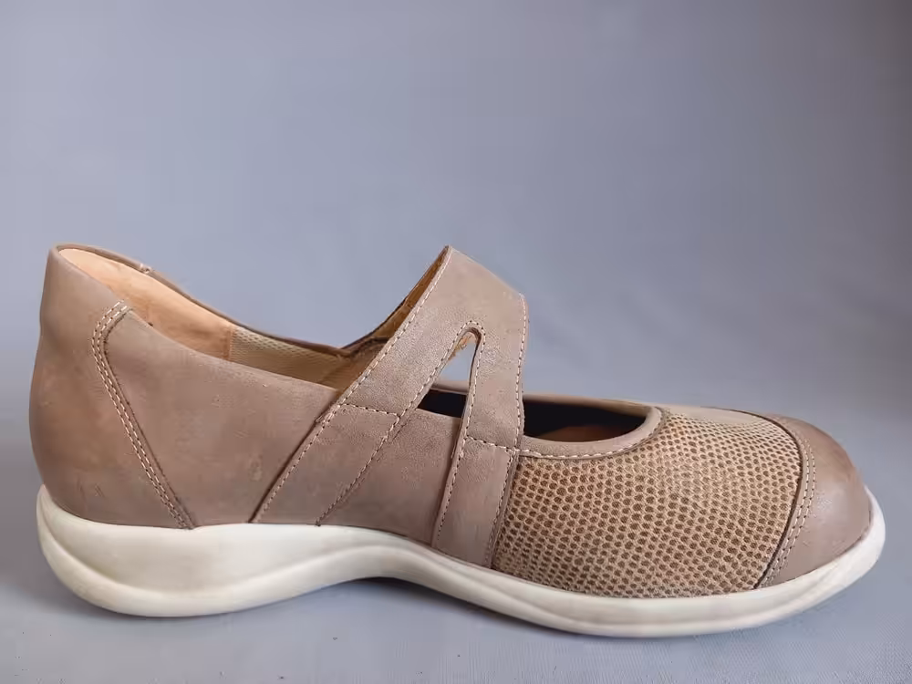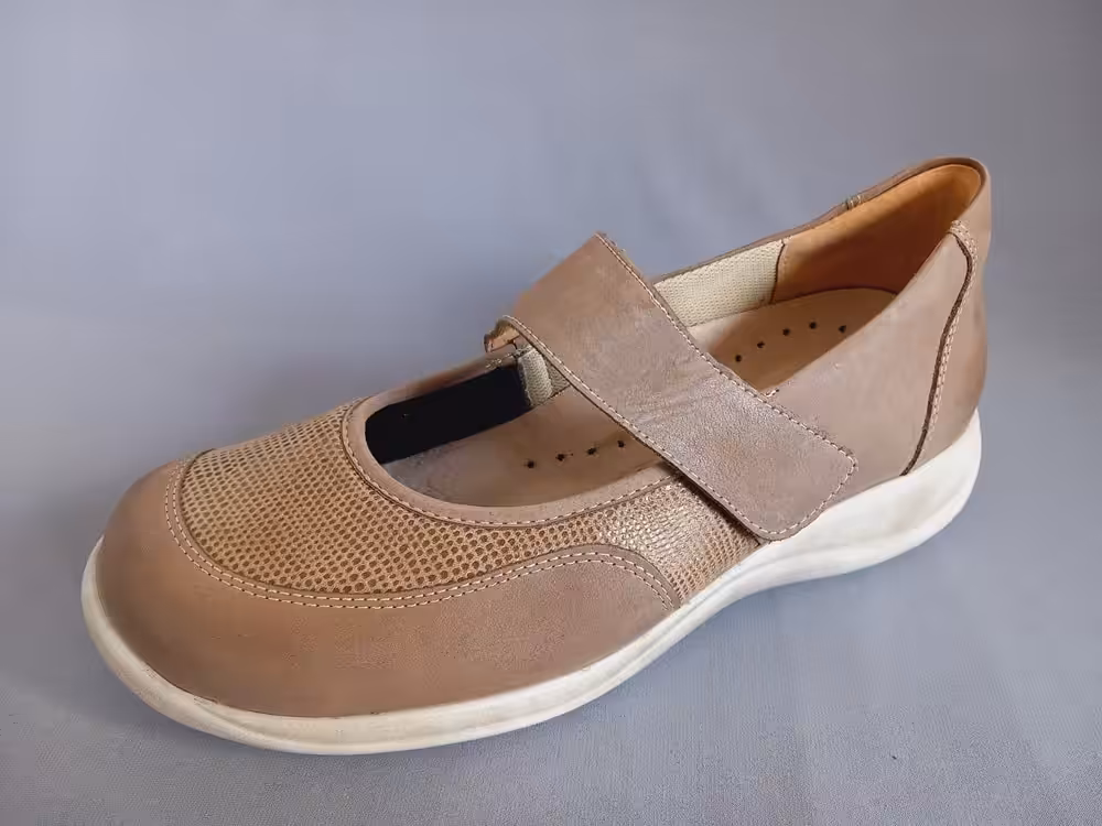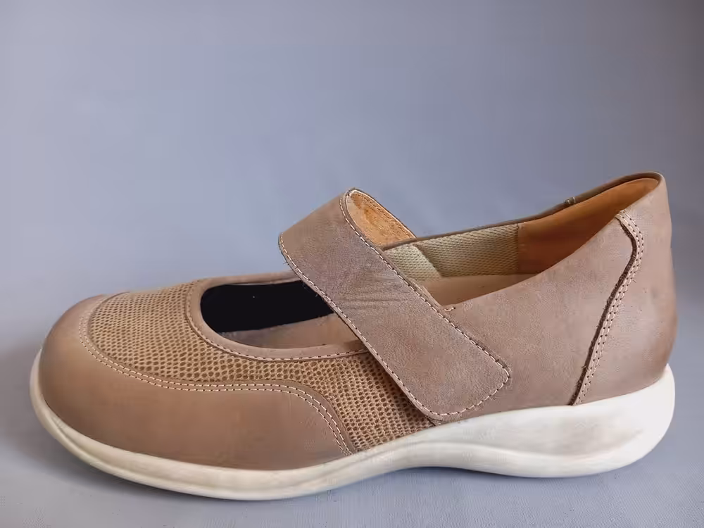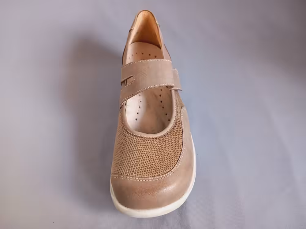 Wykonane ze skóry naturalnej nubukowej i elastycznego materiału typu strecz, takie rozwiązanie jest idealne na obolałe stopy z haluksami, ponieważ cholewka dopasuje się do kształtu. Podeszwa grubsza amortyzuje i chroni przed mikrourazami. Wkładki profilowane z możliwością wyjęcia będą dużym atutem dla osób z indywidualnymi wkładkami ortopedycznymi. Tęgość H dedykowana dla osób z szerokimi stopami. Model posiada cechy obuwia zdrowotnego i profilaktycznego. Pasek na podbiciu przytrzymuje i stabilizuje stopę. Noski okrągłe przez co palce mają dużo miejsca. Panie borykające się z problemem palucha koślawego bardzo chwalą modele z tej serii. Pasują do spodni choć równie ciekawie prezentują się do spódnicy. Klasyczny fason sprawia, że warto mieć taki model w swojej szafie. Wygodne buty do pracy, na wyjazdy lub spacery. W ofercie posiadamy z tej linii buty na każdy sezon: półbuty, sandały i botki.