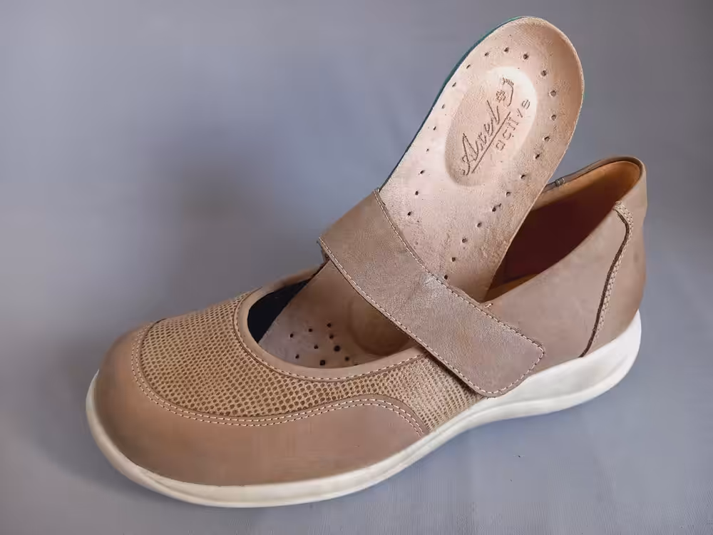 Baleriny zdrowotne Axel 1831 z paskiem który stabilizuje i przytrzymuję stopę w prawidłowym miejscu. Lekkie i szerokie, sprawdzą na haluksy, palce młotkowate. Klasyczny beżowy kolor pasuje do wielu stylizacji. Model bardzo wygodny z profilowanymi wkładkami, idealne do codziennych aktywności. Duża tęgość i wykonanie cholewki sprawdzi się na wrażliwe stopy.