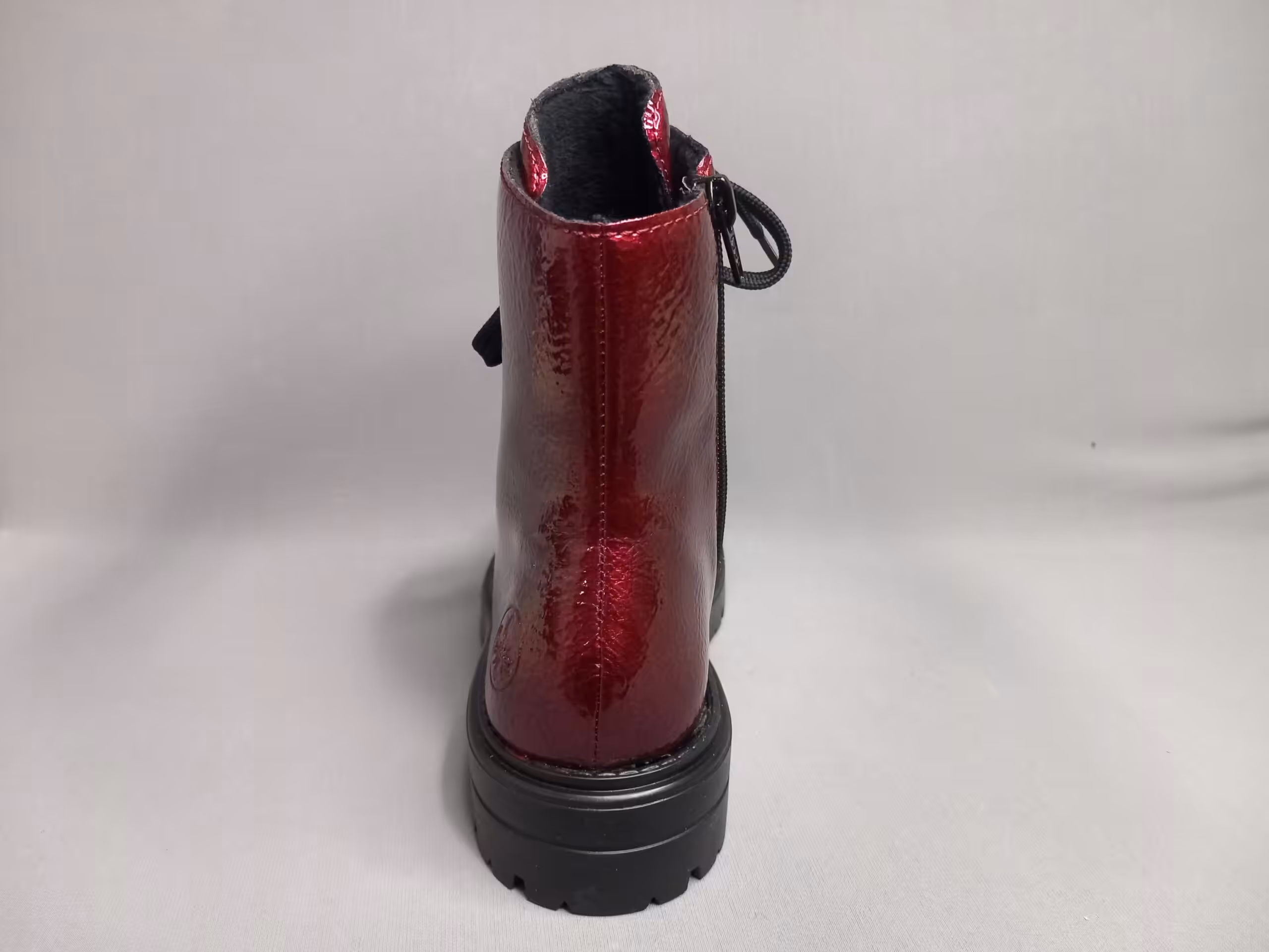 Botki damskie Rieker Z2841-33 w pięknym bordowym kolorze. Wykonane z miękkiej ekoskóry lakierowanej. Sprawdzą się do wielu stylizacji jesiennych i zimowych. Sznurówka i zamek to wygoda w zakładaniu. Świetnie się prezentują na stopach, będą dobrym wyborem  do pracy na spacery i wyjazdy.