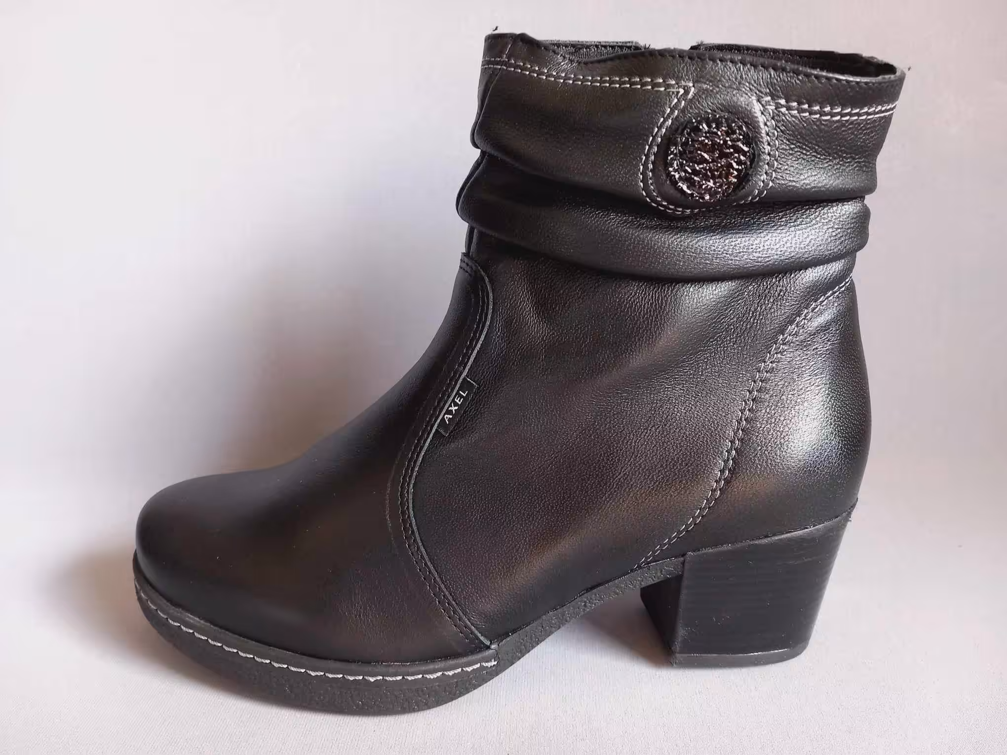 Wygodne i komfortowe botki damskie Axel 4479 prosty klasyczny fason sprawdzi się do wielu stylizacji. Tęgość H idealna na szersze i wrażliwe stopy z haluksami. Ocieplane wnętrze doskonale utrzymuje temperaturę. Delikatne marszczenie przy kostce wygląda efektownie i lepiej przylega do stopy. Podeszwa antypoślizgowa i chroniąca przed zimnem. Nosek zaokrąglony przez co palce mają więcej miejsca. Wkładki ocieplane z możliwością wyjęcia i wymiany na inne. Skóra naturalna licowa łatwa w utrzymaniu czystości i odpowiednia do pastowania. Kolor czarny świetnie i elegancko prezentuje się na stopach.  Pamiętajmy, że regularne czyszczenie i dbanie o buty przedłuża ich ładny wygląd i czas użytkowania. Odpowiednie zabezpieczenie i nawilżanie skór naturalnych powinno być nawykiem każdego klienta.