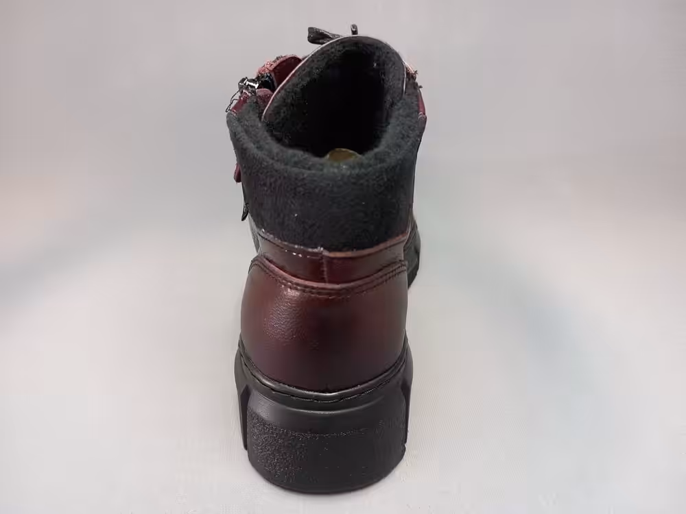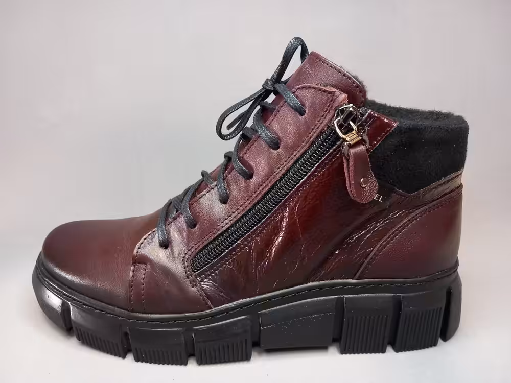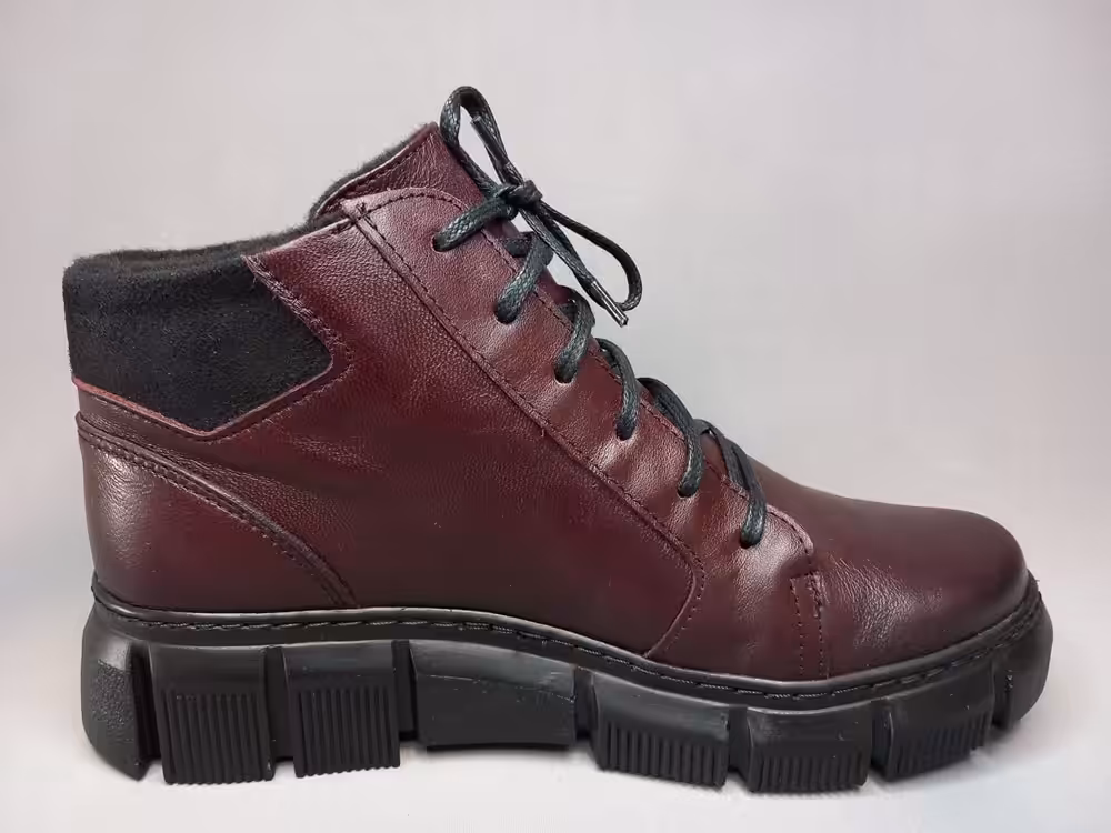 Botki wykonano ze skóry naturalnej licowej i lakierowanej. Dostępne w dwóch wariantach kolorystycznych mega modnym bordowym i klasycznym czarnym. Gruba podeszwa chroni przed zimnem i urazami a do tego wygląda bardzo stylowo. Ocielenie to tak zwany koc obuwniczy. Ciepłe wkładki ruchome więc bez problemu możemy zamienić je na inne własne wkładki profilowane lub ocieplane. Tęgość H do H1/2 dzięki sznurówce możemy wygodnie dopasować je do własnych potrzeb. Bordowa wersja posiada jeden zamek ułatwiający zakładanie. Czarna wersja ma aż dwa zamki przez co buty jeszcze bardziej się otwierają i sprawdzą się nawet na opuchniętą szeroką stopę. Miękka skóra podatna na układanie i dopasowanie się do kształtu stopy dlatego powinny sprawdzić się również na stopy z haluksami lub palcami młotkowatymi. Okrągły szeroki nosek nie ściska stopy przez co palce mają więcej miejsca i luzu. Podeszwa antypoślizgowa sprawdzi się w zimie.