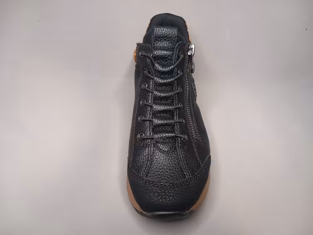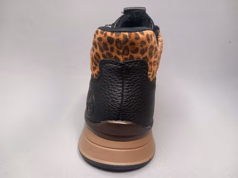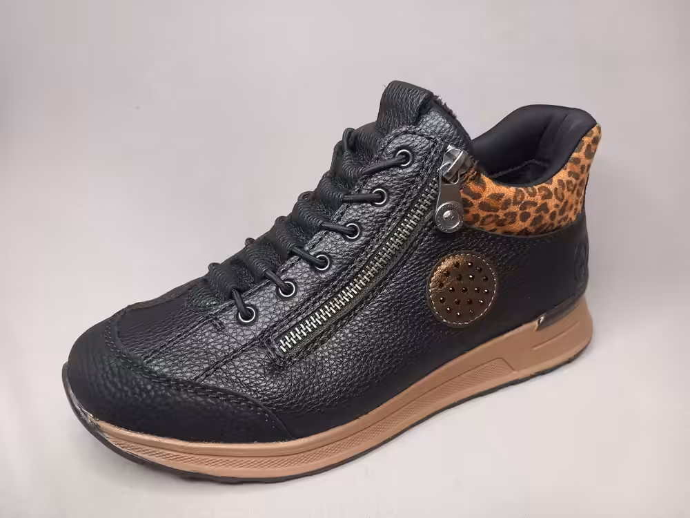 Botki damskie Rieker N1457-00 to buty które założysz bez schylania i bez użycia łyżki mają tak zbudowaną piętę, że nie stanowi to problemu. Dodatkowo mają funkcjonalny zamek który w razie potrzeby może również ułatwić zakładanie. Klasyczny czarny kolor z modnymi wstawkami panterki świetnie sprawdzi się w tym sezonie. Większa tęgość (extra wide) dedykowana na szerzą stopę lub stopy z haluksami. Miękka cholewka ładnie dopasuje się do kształtu stopy.