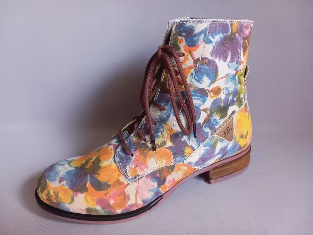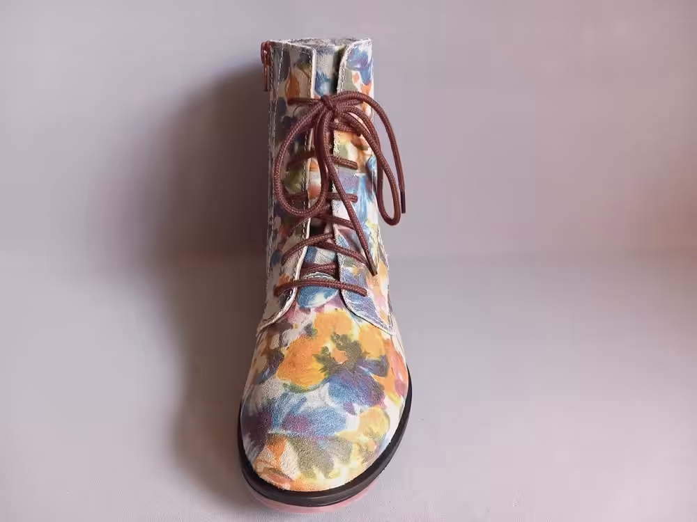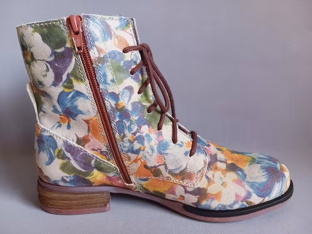 Botki zostały wykonane ze skóry naturalnej nubukowej pięknie farbowanej w kwiatowy wzór. Miękka skóra ładnie układa się do stopy, tęgość G do G1/2 dzięki regulacji za pomocą sznurowadła idealnie dopasujemy je do swoich potrzeb. Kolorystyka bardzo ciekawa i przyciągająca uwagę. Model wpada w oko i pięknie prezentuje się na stopach. W połączeniu z klasycznym płaszczem lub kurtką będzie tworzył stylizację ze smakiem i charakterem. Wnętrze ocieplane polarem. Wkładka filcowa z możliwością wyjęcia i wymiany na inną lub swoją indywidualną wkładkę profilowaną. Zamek ułatwia zakładanie. Podeszwa delikatnie grubsza amortyzuje i chroni przed zimnem i nierównościami. Buty bardzo stabilne i wygodne. Buty warto zaimpregnować przed pierwszym użyciem, impregnat daje ochronę i zabezpieczy buty przed nadmiernym namakaniem. Regularne czyszczenie i dbanie o obuwie przedłuża ich ładny wygląd i sprawia że możemy z nich korzystać przez wiele sezonów.