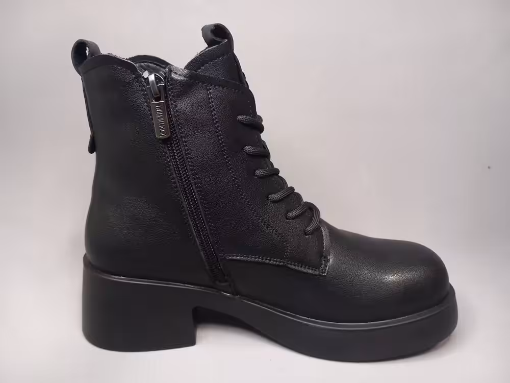 Obuwie wykonano z naturalnej skóry licowej w kolorze czarnym. Sznurowanie pozwala dopasować obuwie do tęgości stopy a zamek ułatwia zakładanie. Podeszwa gruba lekka i elastyczna, fajnie amortyzuje i chroni przed mikrourazami. Obcas szeroki stabilny a jego wysokość to około 5cm. Nosek rozszerzony i okrągły palce mają luz i nie nachodzą na siebie. Bardzo wygodna a zarazem uniwersalna propozycja na ten sezon. Na języku minimalistyczna ozdoba. Ocieplane polarem, wkładki miękkie piankowe świetnie odciążą zmęczone stopy. Super będą wyglądać do jeansów lub spódnicy. Do czyszczenia polecamy pianki i pasty odpowiednie do koloru i rodzaju skóry. Pamiętaj jeśli dbasz o buty one będą ładnie wyglądać i służyć przez długi czas. Sprawdź całą naszą ofertę botków i wybierz idealną parę dla siebie.