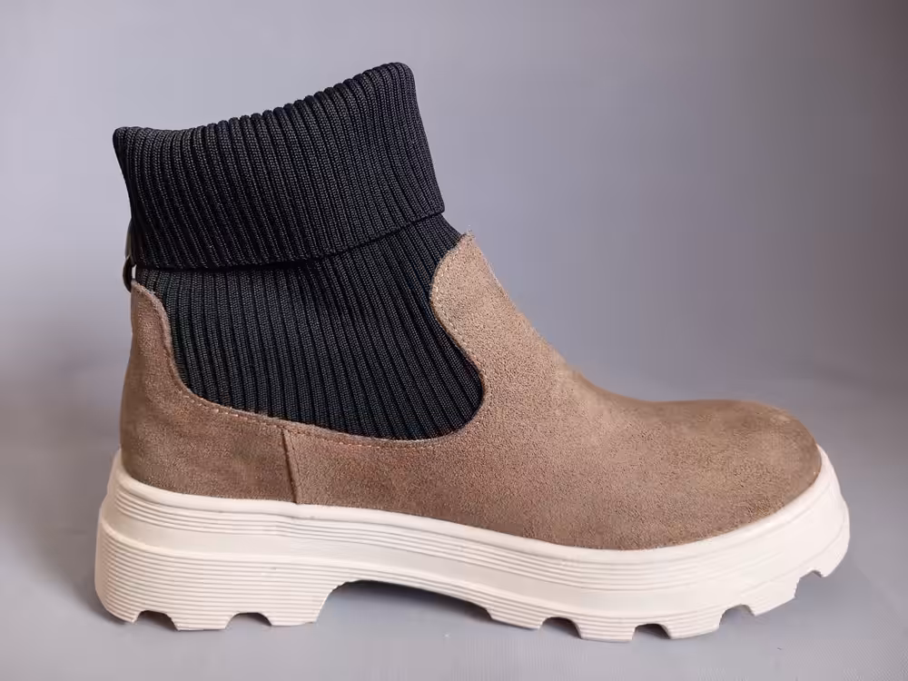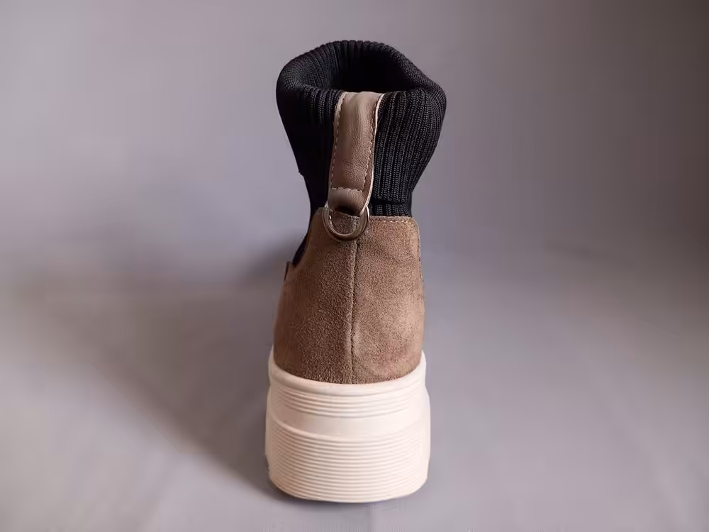 Stylowe botki damskie marki Piazza model 960129-09 Wykonane ze skóry naturalnej zamszowej i z czarnego elastycznego materiału. Podeszwa gruba amortyzuje i chroni przed mikrourazami,  taki typ spodu jest antypoślizgowy i bardzo modny. Kolor delikatnego brązu pasujący do wielu stylizacji. Obuwie lekkie i przyjemne w użytkowaniu. Przód pozbawiony zbędnych szyć, dlatego dobrze sprawdzi się na stopy problematyczne i z delikatnymi haluksami.