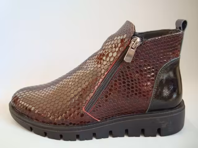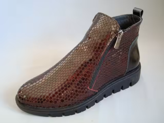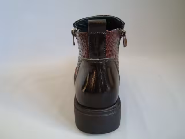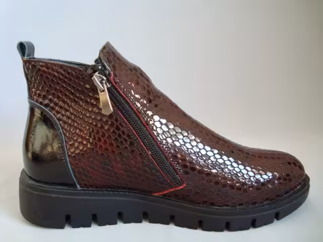 Trzewiki model 96 22 82 w kolorze bordowym wyprodukowany jest ze skóry naturalnej lakierowanej imitowanej na łuskę. Niezwykła miękkość skóry cholewki oraz wkładki wpływa na maksymalny komfort. Powyższy model ocieplony jest delikatnym polarem. Stylizacja modelu łączy kobiecą subtelność z praktycznością. Dzięki wygodnej wkładce but doskonale dopasuje się do kształtu stopy i zapewnia niebywałą swobodę chodzenia. Zapinanie na dwa zamki ułatwia zakładanie. Podeszwa wysokogatunkowa, antypoślizgowa, zapewniająca stabilność. Płaskie podeszwy ułatwiają codzienne czynności i są niezwykle wygodne. Tęgość standardowa. Nosek lekko zwężony bardzo zgrabny. Kierowana jest do klientek najbardziej wymagających. Jedną z charakterystycznych cech są lekkie podeszwy. Obuwie marki Piazza zaliczane jest również do bardzo trwałego. Z troską o klienta i odpowiedzialnością proponujemy powyższą markę.