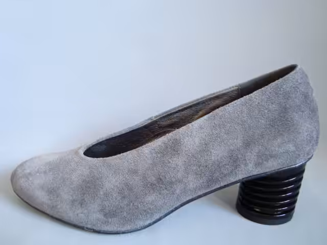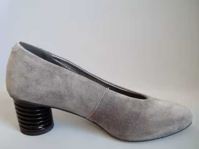 Czółenka damskie Lampert model 1131ALMI Obuwie wykonane ze skóry naturalnej zamszowej w kolorze szarym. Bardzo modny kolor tej jesieni, ciekawy wzór przyciąga uwagę. Obcas stabilny o stylowym kształcie. Noski delikatnie zaokrąglone, wycięcie cholewki w literę V optycznie wysmukla stopę. Wkładka miękka profilowana. Tęgość G 1/2 sprawdzi się na delikatnie szerszą stopę.