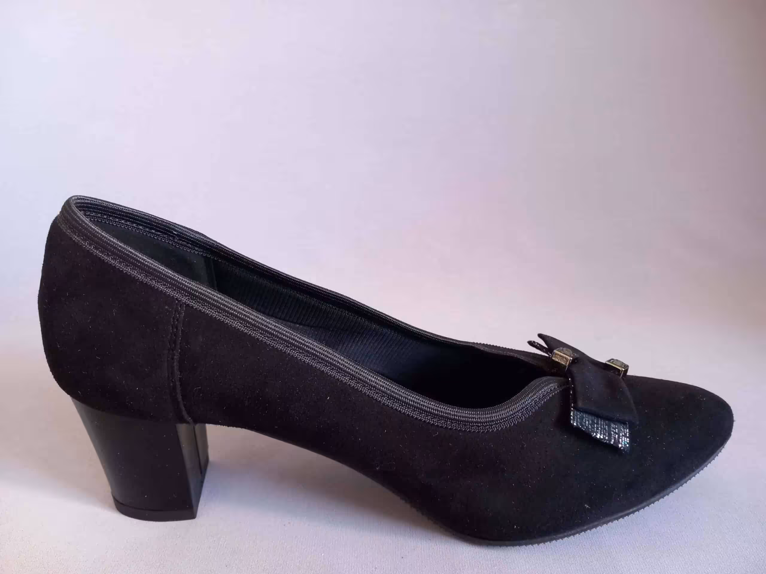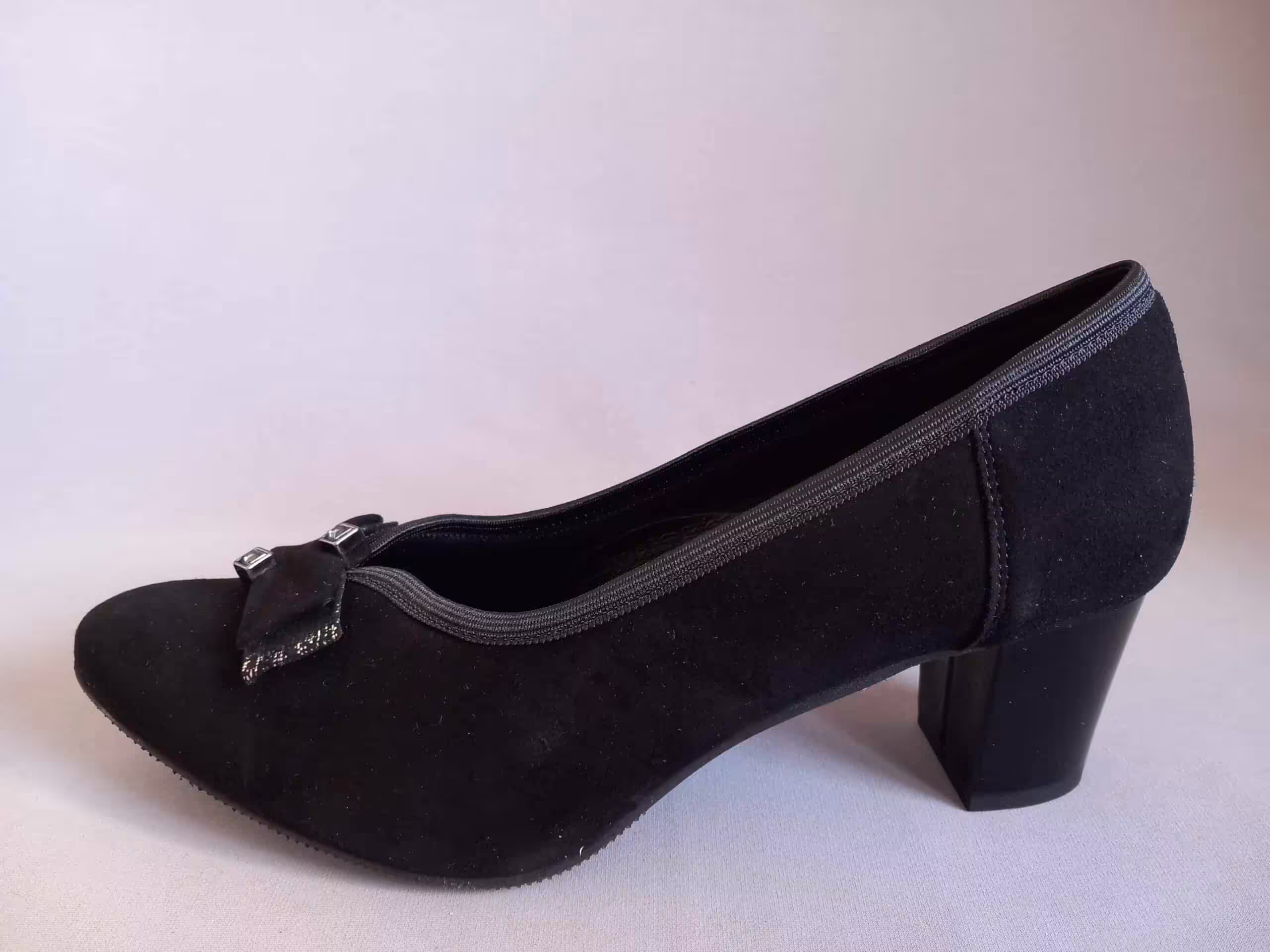 Czółenka polskiej marki Lampert, model 0952610SR83N10Zw kolorze czarnym. Sprawdzą się w każdej kobiecej garderobie, idealne na wyjścia lub do pracy dla wymagających pań. W ofercie rozmiary od 35 do 42. Cholewka specjalnie zaprojektowana tak aby ukryć haluksy lub palce młotkowate. Obuwie wykonane z największą starannością z wysokiej jakości skóry naturalnej zamszowej. Tęgość G do H przez co buty sprawdzą się również na nieco szerszą stopę. Podeszwa elastyczna, wkładki piankowe profilowane wykończone skórą naturalną, podnoszą komfort użytkowania i odciążają zmęczone stopy. Kolor czarny bardzo modny, ponadczasowy. Delikatna ozdoba dodaje charakteru. Obcas 5,5 cm stabilny i dobrze wyważony. Tasiemka przy wykończeniu cholewki otula stopę przez co czółenka bardzo ładnie się prezentują.