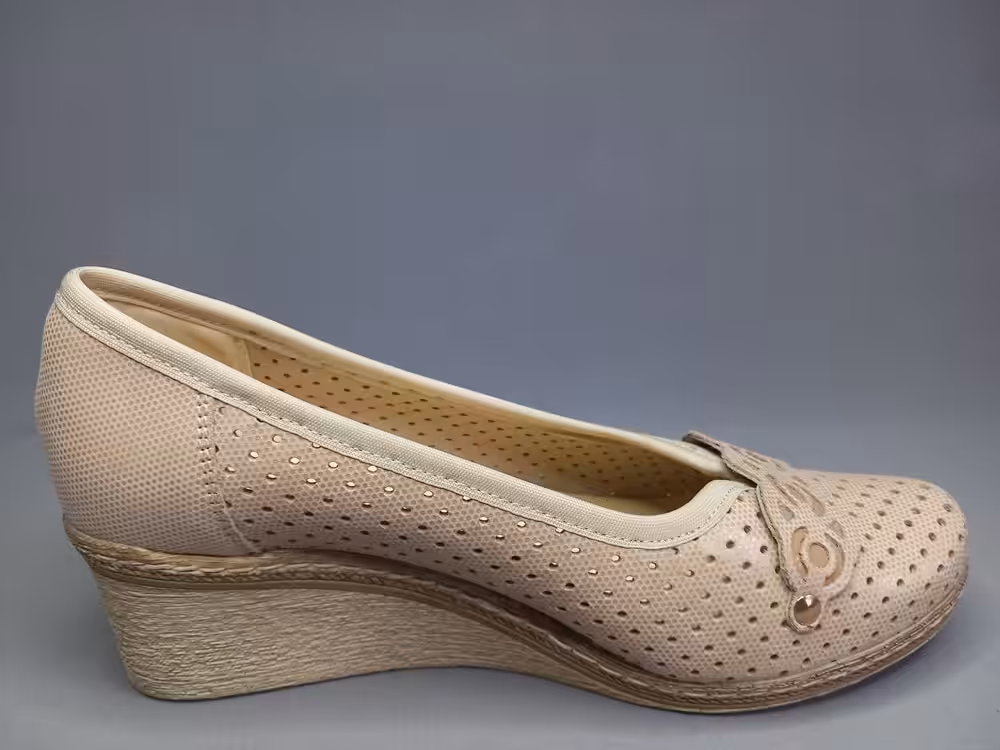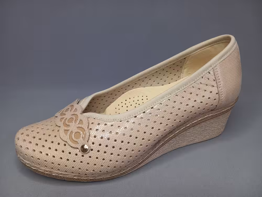 Obuwie zostało wykonane z wysokiej jakości skóry naturalnej nubukowej, nabłyszczanej. Perforacja cholewki to super rozwiązanie, ponieważ buty sprawdzą się nawet w upalne dni. Podeszwa typu klin, koturn, stabilna i łatwa w utrzymaniu czystości. Beżowy ponadczasowy kolor zawsze warto mieść w swojej szafie. Delikatna ozdoba przyciąga uwagę wygląda stylowo. Miękkie profilowane wkładki podnoszą komfort użytkowania. Wnętrze butów również wykonane z najwyższej jakości skór naturalnych. Nosek zaokrąglony przez co palce mają więcej miejsca. Tęgość G1/2 dedykowana dla kobiet z delikatnie szerszymi stopami. Kształt cholewki pozwala na dopasowanie butów na stopy z małymi haluksami. Zapraszamy do śledzenia naszej oferty i wyboru odopowiedniego wzoru dla siebie.
