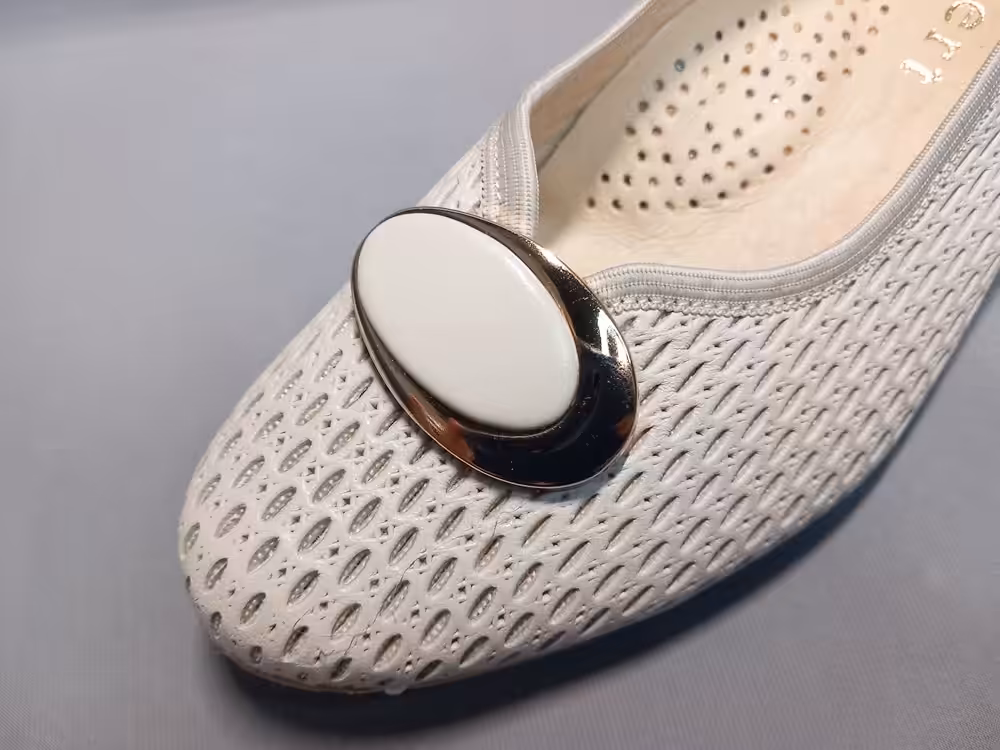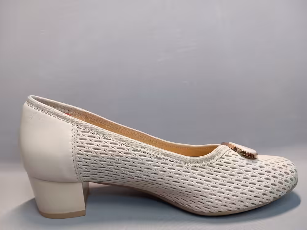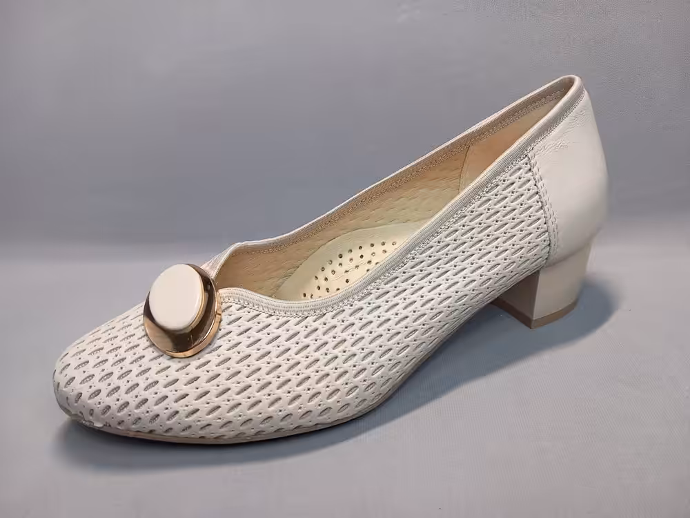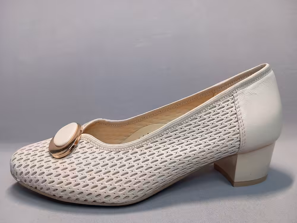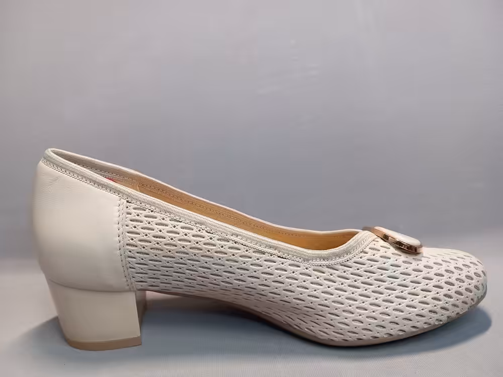 Czółenka Lampert 02820104 tęgość-H klasyczny i ponadczasowy wzór z ażurową cholewką która poprawia cyrkulację wewnątrz buta. Kolor kremowy wpasowujący się w obecne trendy. Złota ozdoba dodaje uroku i eleganckiego charakteru. Obcas stabilny około 4,5cm wysokości. Model sprawdzi się do wielu stylizacji na większe wyjścia lub do codziennych eleganckich sukienek. Większa tęgość daje nam komfort i lepsze dopasowanie do potrzeb stóp z problemami.