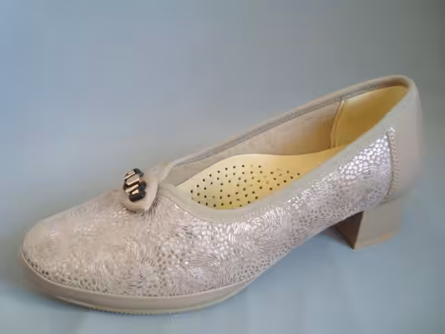 Podeszwa elastyczna, wkładki piankowe profilowane wykończone skórą naturalną, podnoszą komfort użytkowania i odciążają zmęczone stopy. Kolor beżowy bardzo modny i ponadczasowy. Delikatna ozdoba dodaje charakteru. Obcas 4 cm stabilny i dobrze wyważony. Tasiemka przy wykończeniu cholewki otula stopę przez co czółenka bardzo ładnie się prezentują. Miękka cholewka, bez zbędnych szyć idealna dla osób z haluksami i wrażliwą stopą. Profilowana skórzana wkładka i miękkie delikatne materiałowe wykończenie wnętrza. Tasiemka, obszycie cholewki to dzięki niej obuwie ładnie przylega do stopy. Stabilny 4 cm obcas podbity flekiem. Podeszwa wykonana z wytrzymałego i elastycznego tworzywa, antypoślizgowa.