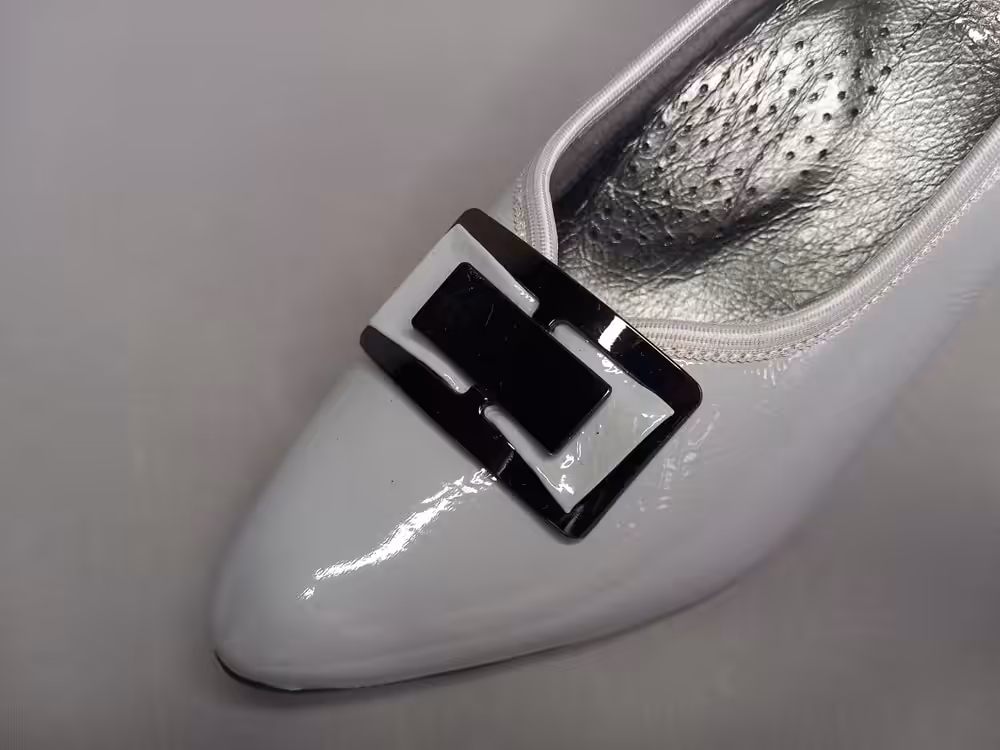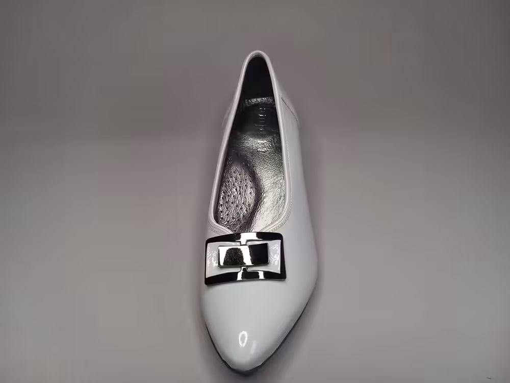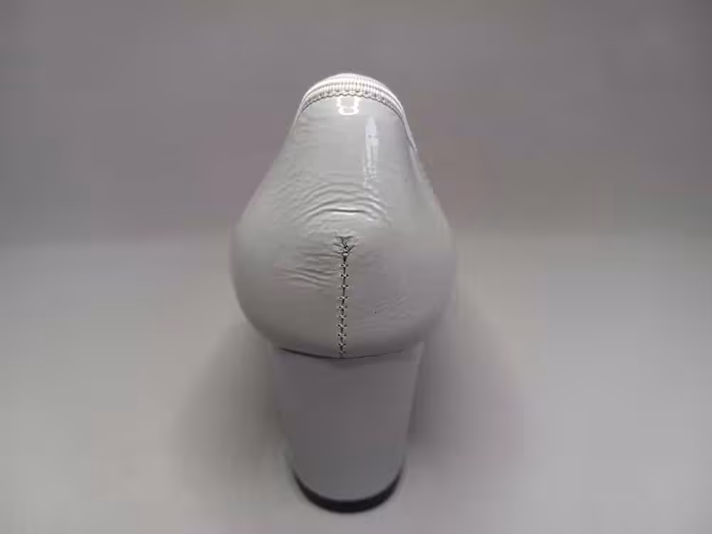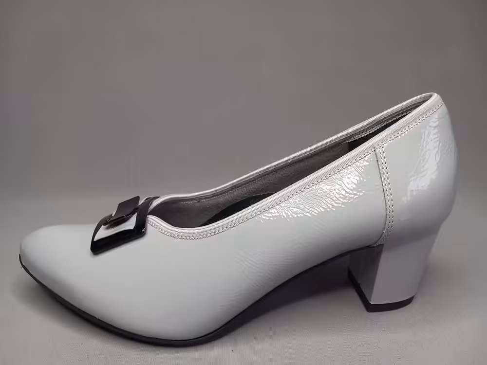 Obuwie zostało wykonane z naturalnej skóry lakierowanej. Kształt cholewki sprawdzi się również przy stopach z małymi haluksami. Tęgość G1/2 dedykowana dla kobiet z delikatnie szerszymi stopami. Wnętrze zostało wyścielone materiałem oddychającym aby dodać komfortu i wygody podczas użytkowania. Profilowana skórzana wkładka odciąży zmęczone stopy. Tasiemka która jest wykończeniem cholewki przylega do stopy przez co buty nie odstają i prezentują się elegancko. Kolor jasno szary łatwo połączyć z kolorowymi sukienkami lub cygaretkami. Buty dzięki swojej wygodzie są wybierane również jako obuwie do pracy i na formalne wyjścia. Obcas stabilny podeszwa antypoślizgowa idealnie się do tego sprawdzi.