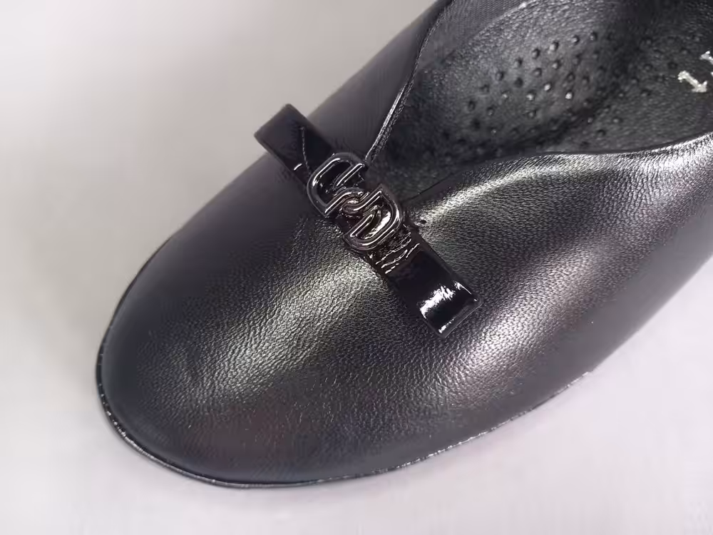 Obuwie zostało wykonane z miękkiej skóry licowej z wstawkami lakierowanymi. Delikatne wnętrze wyścielone materiałem oddychającym. Wkładki skórzane profilowane podnoszące łuk stopy. Podeszwa elastyczna wykonana z tworzywa wysokiej jakości, obcas stabilny bez fleków przez co jest bardzo praktyczny a wygląda elegancko. Noski zaokrąglone prze co palce mają więcej miejsca i nie są ściśnięte. Cholewka mięciutka dlatego powinna świetnie sprawdzić się na stopy wrażliwe z haluksami lub palcami młotkowatymi. Jeśli na co dzień nie chodzisz w butach na obcasie to ten model sprawdzi się na wyjścia okolicznościowe ze względu na swoje wyprofilowanie i krój. Cholewka optycznie wysmukla i ładnie przylega do stopy. Tęgość G1/2 daje nam komfort i wygodę podczas użytkowania. Czarny kolor pasuje do wszystkiego i warto mieć go w swojej szafie. Regularne czyszczenie i dbanie o buty pozwoli na ich wieloletnie użytkowanie.