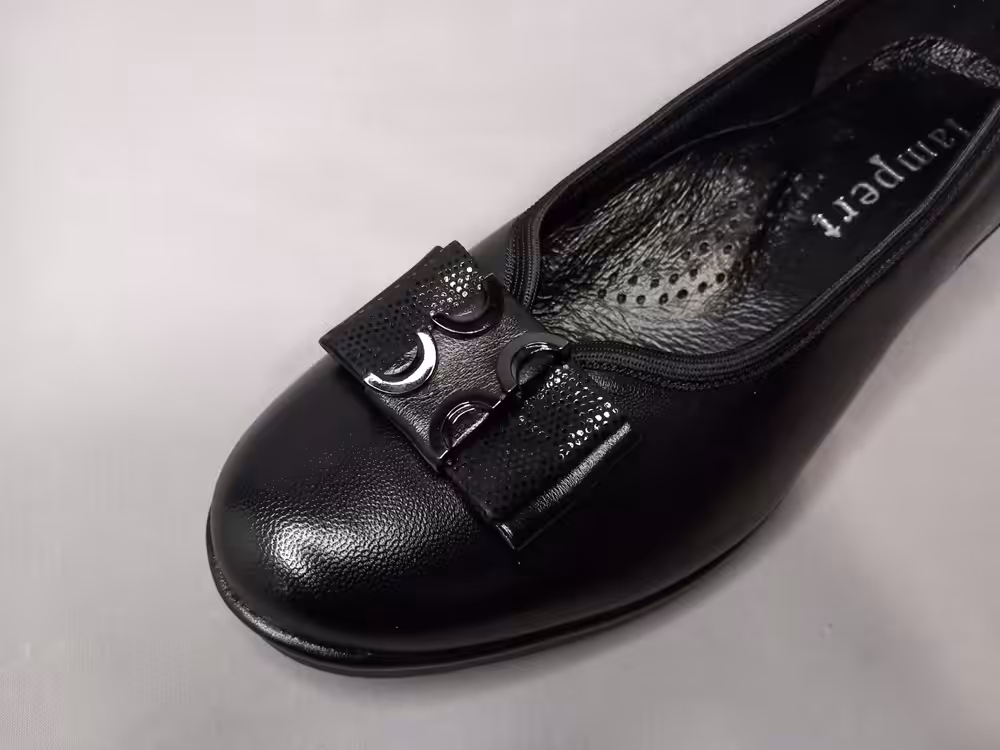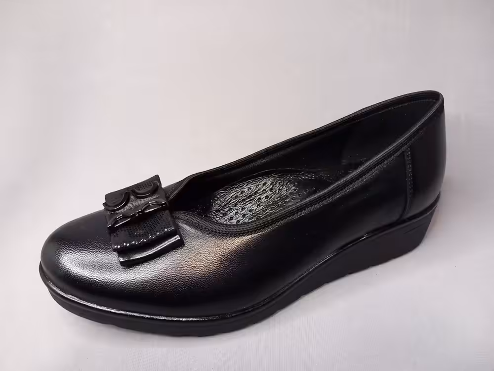 Buty zostały wykonane z najwyższej jakości skóry naturalnej licowej w kolorze czarnym. Wnętrze wyścielone zostało oddychającym materiałem tekstylnym. Podeszwa grubsza chroni przed nierównościami terenu. Tęgość G 1/2 dedykowana na szerszą stopę. Obszycie cholewki w postaci tasiemki ładne otula stopę i do niej przylega. Ozdoba elegancka dodająca uroku jest ciekawym akcentem. Nosek zaokrąglony przez co palce mają więcej miejsca i luzu. Wkładki profilowane skórzane podnoszą komfort użytkowania i odciążą zmęczone stopy. Wzór świetnie sprawdzi się na co dzień jak i do bardziej eleganckich stylizacji dla osób nie lubiących obcasów. Delikatna forma balerinki na koturnie będzie pasować do spodni i sukienki. Łatwe w utrzymaniu czystości wystarczy pianka i pasta do obuwia.