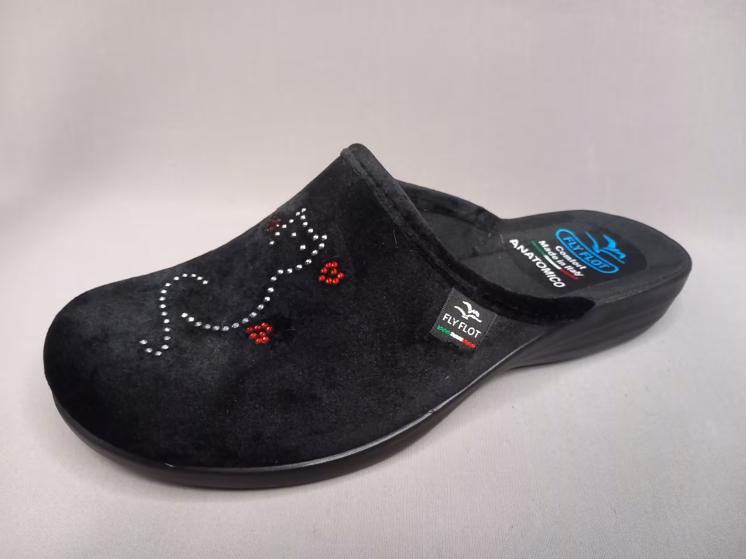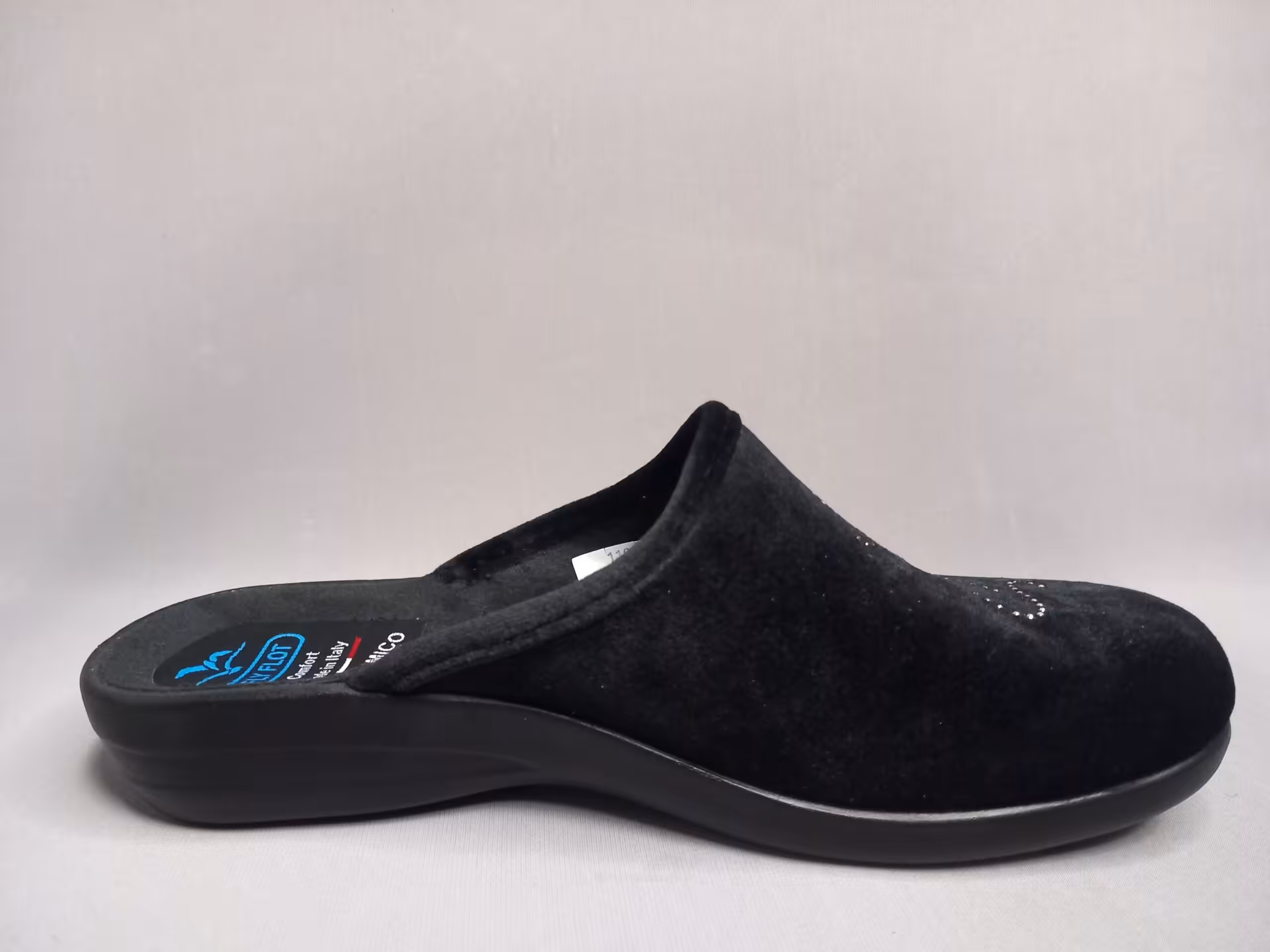 Kapcie domowe damskie Fly Flot P3Z51PD to lekka i wygodna propozycja obuwia które sprawdzi się na stopy z haluksami. Lekkie elastyczne spody, delikatny klinik pod pięta. System anatomico to lepsze profilowanie spodów aby podnieść komfort użytkowania. Czarny kolor z ozdobnym a zarazem delikatnym zdobieniem na cholewce. Wykonane z przyjemnego w dotyku weluru. Otulą nasze stopy w chłodniejsze dni. Noski zaokrąglone przez co palce mają więcej miejsca i nie są ściśnięte. Cholewka w palcach bez szyć przez co ładnie układają się do kształtu stopy. W środku w samym czubku delikatne i miękkie wzmocnienie materiału aby palce nie wypychały przodów. Elastyczna podeszwa zapewnia komfort podczas codziennych aktywności w domu. Szukasz minimalistycznych kapci domowych to ten model jest właśnie dla Ciebie.