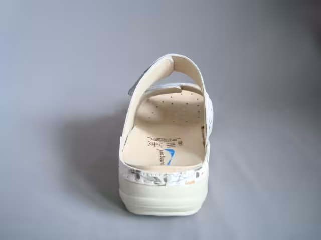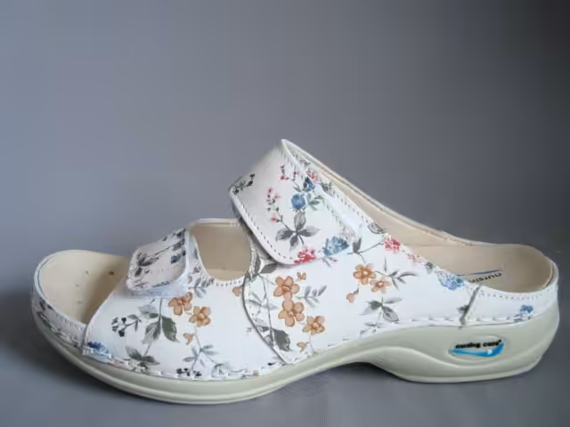 Zdrowotne klapki marki Nursing Care model Viena. Buty zostały wykonane z naturalnej skóry. Dzięku anatomicznej podeszwie obuwie umożliwia utrzymanie poprawnej postawy ciała. Wymienna anatomiczna wkładka absorbuje wstrząsy podczas chodzenia oraz nadaje odpowiednie wsparcie dla stóp. Obuwie Wash’Go jest antypoślizgowe oraz antystatyczne. Buty można prać w pralce w temperaturze 30 stopni nie tracąc przy tym kolorów i giętkości. Dzięki innowacyjnej technologi skóra po praniu nie staje się sucha i twarda co pozwala na długie użytkowanie. Dodatkowo możliwość wymiany wkładek, jest dużym plusem dla osób które posiadają swoją indywidualną wkładkę ortopedyczną. Obuwie sprawdzi się również jako robocze, dla personelu medycznego, aptekarek, i osób które w pracy spędzają wiele godzin na nogach. Kolorowy print dodaje uroku i lekkości. Rzepy umożliwiają wygodną regulację do szerokości stopy. Tęgość określamy na G, G1/2, H. Wygodne i komfortowe klapki o cechach obuwia profilaktycznego, i zdrowotnego. Zasady prania obuwia: