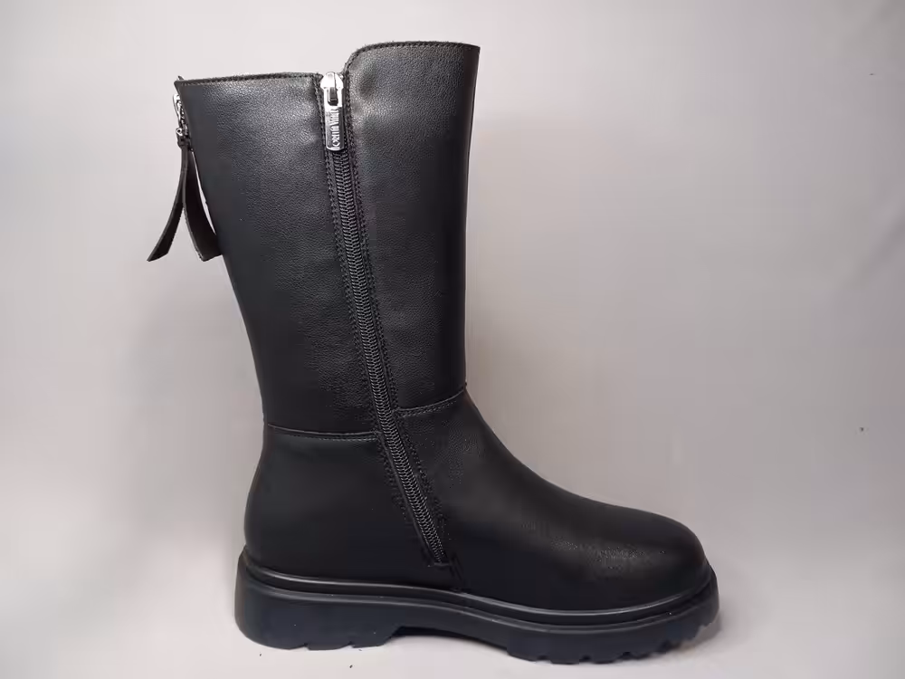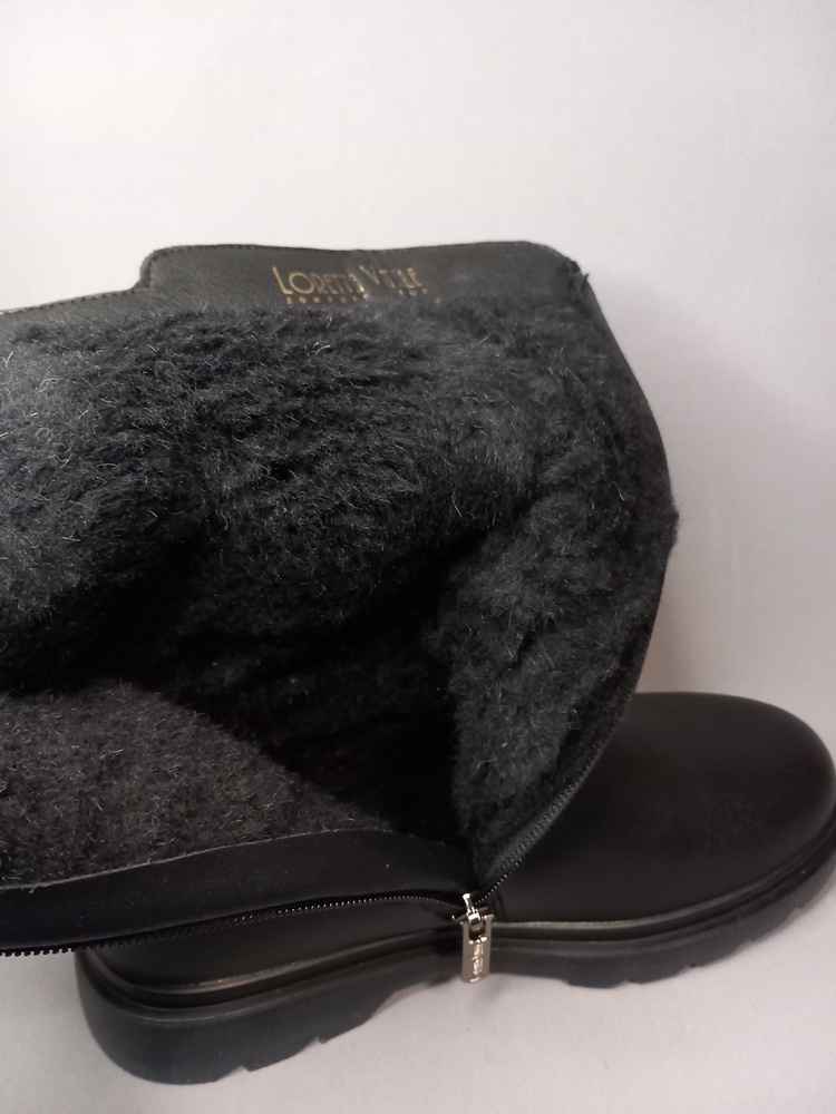 Kozaki Loretta Vitale W3503A miękkie i szalenie wygodne obuwie zimowe. Wykonane z naturalnej skóry licowej w kolorze czarnym. Tęgość G do G1/2 bez szyć w przedniej części cholewki dlatego dobrze powinny sprawdzić się na stopy z haluksami. Elastyczne gumowe podeszwy zapewniają komfort i wygodę podczas użytkowania. Zapinane na zamek, wnętrze w całości ocieplane kocem obuwniczym o strukturze owczej wełny. Świetnie sprawdzą się do sportowych jak i bardziej eleganckich stylizacji. Miękka cholewka ładnie ułoży się do stopy.