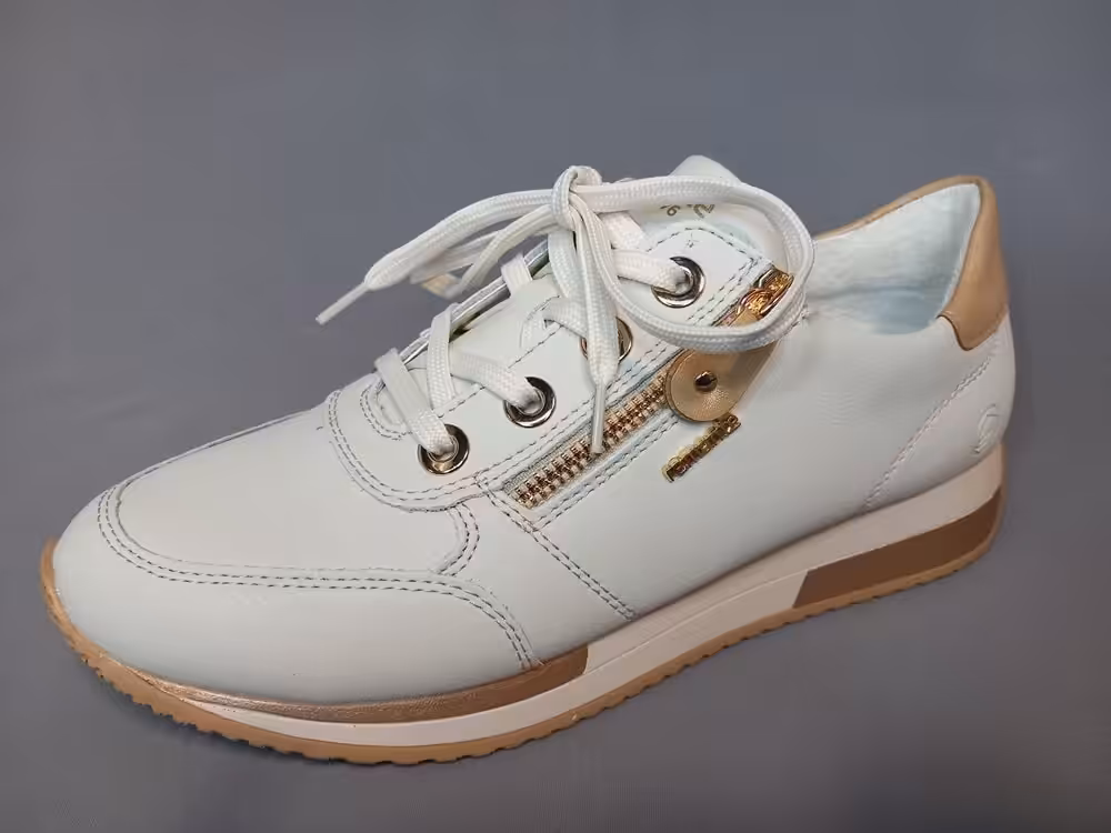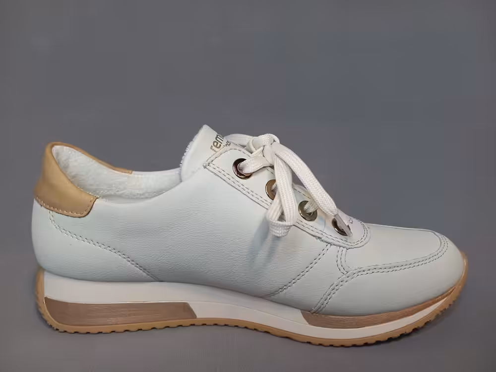 Modne sneakersy Remonte D0H11-81 to klasyczne a zarazem ciekawe obuwie o sportowym charakterze. Wiązane z wymienną wstążką która jest ładnym i modnym dodatkiem a w zależności od stylizacji możemy już użyć lub nie. Lekkie i przyjemne na nogach tęgość standardowa. Wkładki które bez problemu możemy wyjąć wyczyścić lub zamienić na własne ortopedyczne są dużym ułatwieniem. Delikatny beżowy kolor wpasowuje się w obecne trendy i zadowoli wymagające klientki.