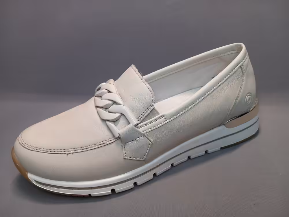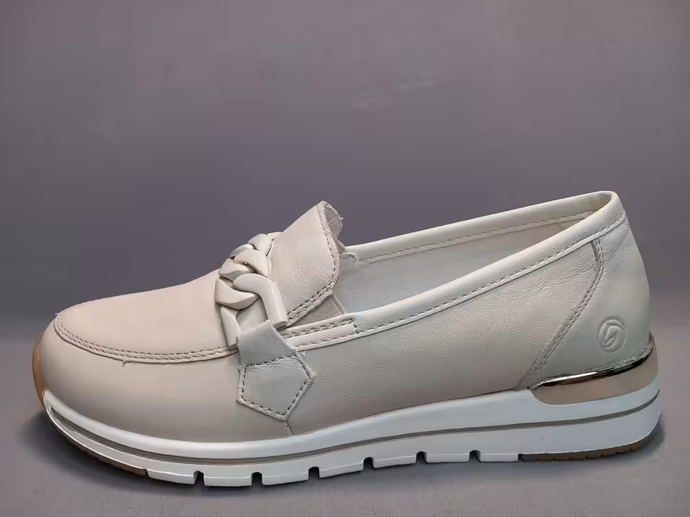Mokasyny damskie Remonte R6711-60 to wyjątkowy model który sprawdzi się do jeansów lub sukienki. Modne rozwiązanie które wpada w oko i sprawdzi się w różnych sytuacjach. Wygodna i stabilna podeszwa podnosi komfort użytkowania, miękkie wkładki odciążą zmęczone stopy. Piękny kremowy kolor wpasowuje się obecne trendy. Z marką Remonte będziesz stylowa i poczujesz prawdziwy komfort.  Tęgość G do G1/2 standardowa.