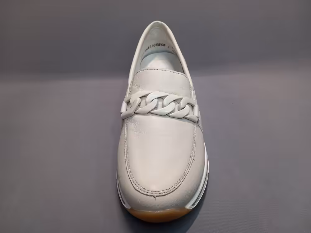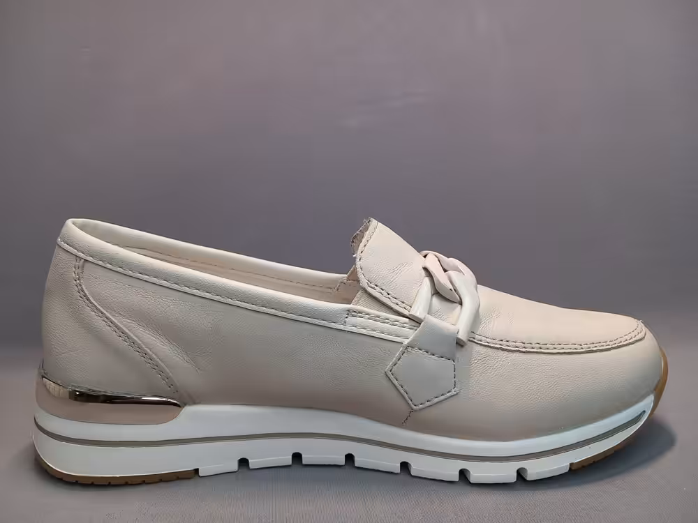 Obuwie zostało wykonane z naturalnej licowej skóry w kolorze kremowym, beżowym. Na cholewce modna aplikacja w postaci łańcucha. Podeszwa  grubsza antypoślizgowa i amortyzująca. W tylnej jej części srebrna lustrzana wstawka. Wnętrze zostało wyścielone materiałem, wkładki soft miękkie i delikatnie profilowane z możliwością wyjęcia i zastosowania własnych wkładek robionych na zamówienie u podologa lub ortopedy. Mokasyny to klasyczny i ponadczasowy krój obuwia który często jest wybierany przez nasze klientki. Łatwe w utrzymaniu czystości, wystarczy pianka i bezbarwna pasta. Tęgość G do G1/2 dedykowana na stopy standardowe. Sprawdź całą naszą kolekcję mokasynów, w ofercie posiadamy różne marki i kolory.