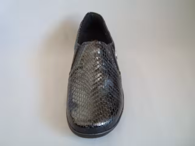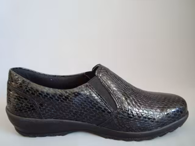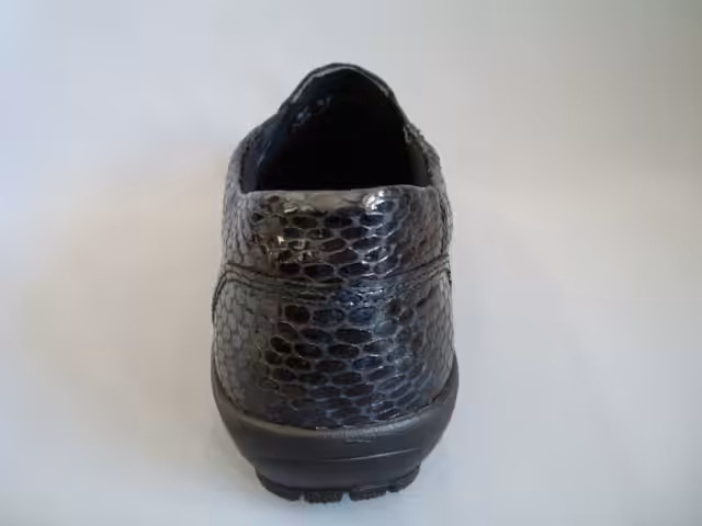 Półbuty damskie marki Comfortable model 940 058-05 w kolor ciemny granat wykonane ze skóry naturalnej lakierowanej imitującej skórę wężową, co wpływa na kobiecy wizerunek. Tęgość K dedykowana na szerokie stopy. Podeszwa grubsza amortyzuje i chroni przed mikrourazami, antypoślizgowa z dobrą przyczepnością do podłoża. Wkładki profilowane, przyjazne dla skóry stopy. Dodatkowo ów model wyposażony jest w membranę ALPITEX przeciw przemakaniu. Ponadto dzięki wyjmowanym wkładką możemy zastosować swoje indywidualne robione u ortopedy. Noski szerokie, zaokrąglone umożliwiają komfort palcom.