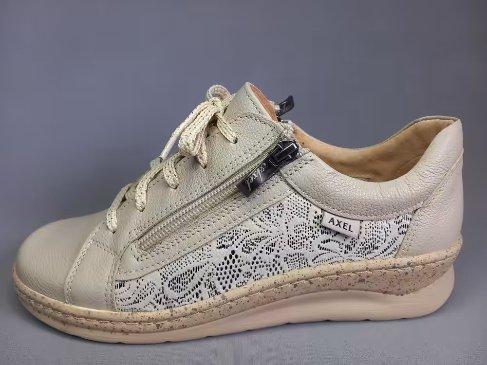 Półbuty damskie Axel 1948 sportowy lekki fason obuwia idealny na wiosnę. Kolor beżowy uniwersalny i bardzo praktyczny. Tęgość H dedykowana na szerokie stopy i wyższe podbicie. W zestawie producent dokłada drugą parę wkładek aby zmniejszyć delikatnie tęgość butów do G1/2 . Wiązane z praktycznymi dwoma zamkami ułatwiającymi zakładanie. Sprawdzą się do wielu stylizacji dlatego warto mięć taki model w swojej szefie. Łatwe w utrzymaniu czystości.
