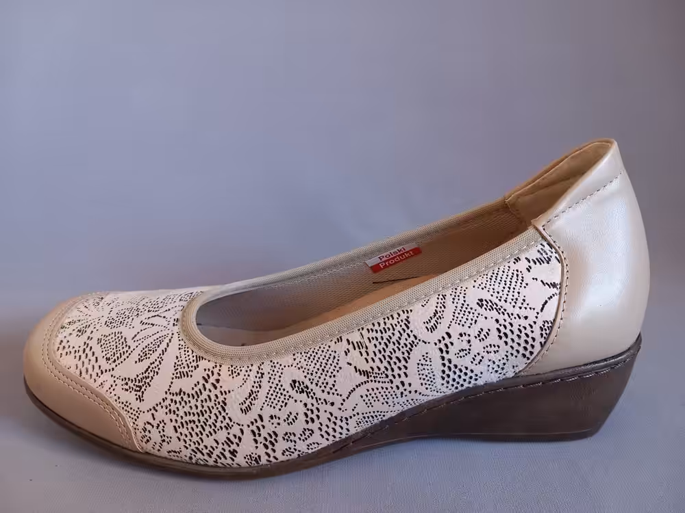 Obuwie wykonane ze skóry naturalnej licowej i materiału elastycznego typu strecz. Profilowane wyjmowane wkładki są dobrym rozwiązaniem dla osób ze swoimi indywidualnymi zdrowotnymi wkładkami. Tęgość G1/2 dedykowana na delikatnie szersze stopy. Rozciągliwa wstawka przy palcach sprawdzi się na stopy z haluksami, ponieważ jest delikatna i od razu układa się do kształtu stopy. Koturn stabilny jego wysokość to 4,5cm. Buty są lekkie i łatwe do zakładania. Podeszwa chroni przed mikrourazami i podnosi komfort użytkowania.  Model uniwersalny idealny do codziennych aktywności. Wnętrze to materiał oddychający podnoszący komfort użytkowania nawet w cieplejsze dni. Regularne czyszczenie i dbanie o buty przekłada się na ich ładny wygląd i długi czas użytkowania.