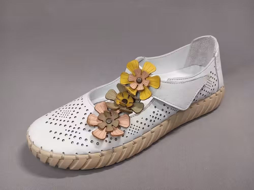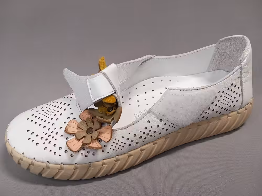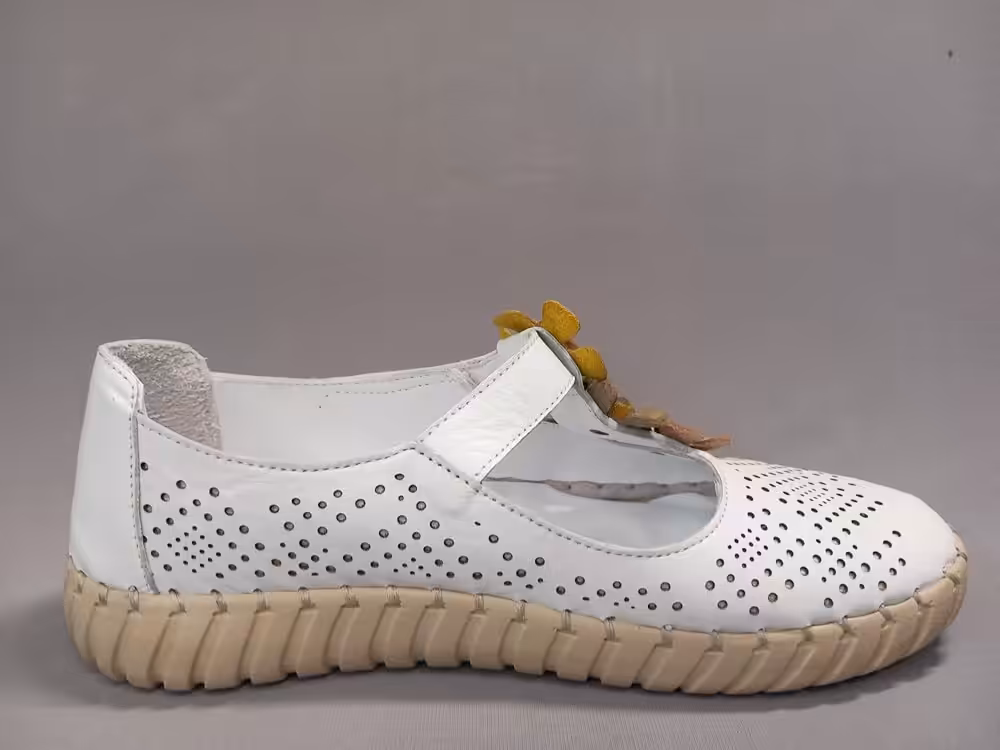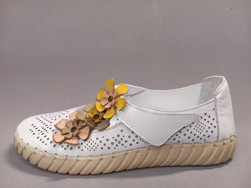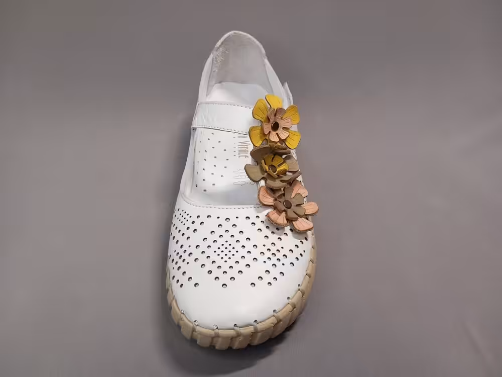 Półbuty pasek LorettaVitale 5335 lekkie i wygodne buty wiosenno letnie. Ażurowe wycięcia dodają lekkości a pasek zapinany na rzep pozwala na lepsze dopasowanie. Urocza ozdoba w postaci kolorowych kwiatków dodaje charakteru i jest bardzo modna w tym sezonie. Model sprawdzi się do spodni i letniej sukienki. Biały kolor uniwersalny i pasujący do wielu stylizacji. Miękka cholewka ładnie układa się do kształtu stopy.