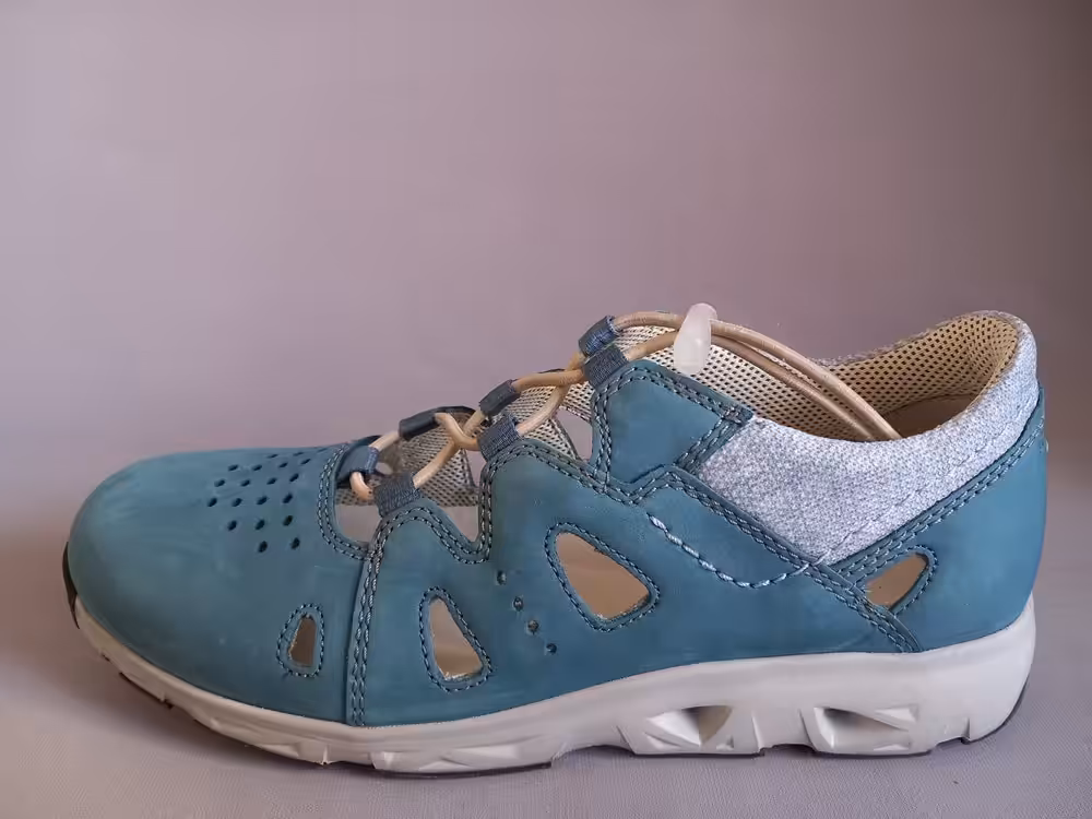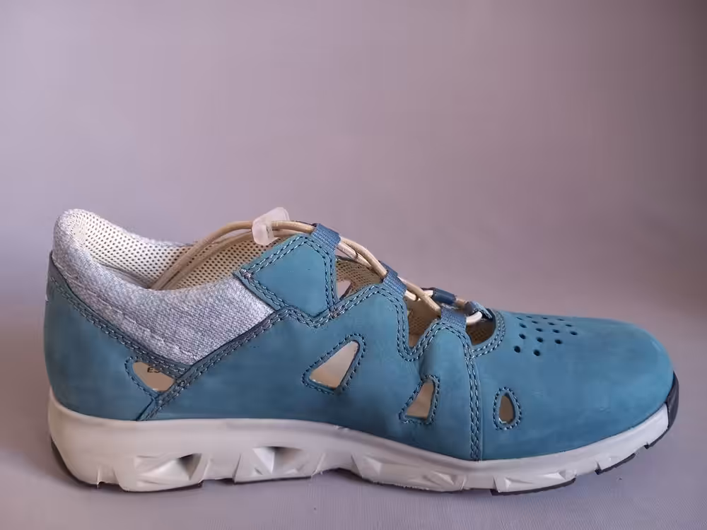 Obuwie w tęgości H dedykowane na szersze stopy, odpowiednie również na haluksy, palce młotkowate. Nosek szeroki zaokrąglony przez co palce mają więcej miejsca. Wycięcia cholewki poprawiają cyrkulację powietrza w bucie. Grubsze podeszwy chronią przed mikrourazami i są antypoślizgowe. Regulacja za pomocą elastycznych gumek, praktyczna i ułatwia zakładanie. Kolor niebieski bardzo modny wpisuje się w obecne trendy i sprawdzi się do wielu stylizacji. Wkładki piankowe z wierzchnią warstwą skóry, z możliwością wyjęcia i zastosowania własnych ortopedycznych wkładek. Wnętrze wyścielone materiałem oddychającym, takie rozwiązanie podnosi komfort użytkowania. Obuwie warto regularnie czyścić i impregnować wtedy posłuży nam bardzo długo. Model sprawdzi się na wycieczki, spacery lub do pracy. Sportowy rodzaj półbutów wiosenno letnich warto mieć w swojej szafie.