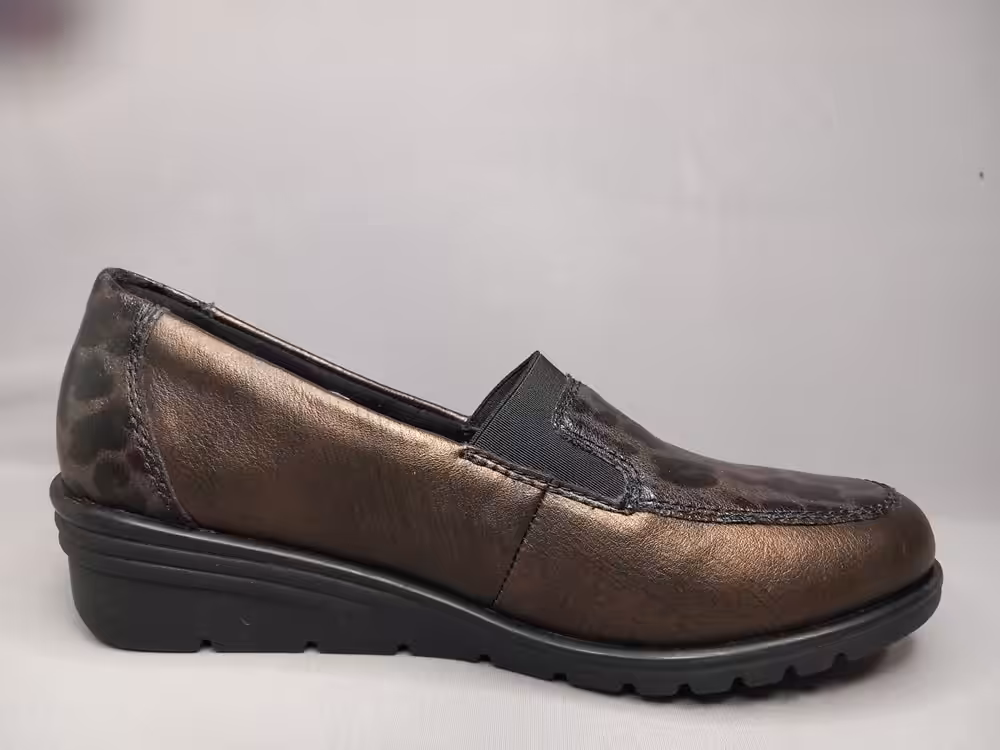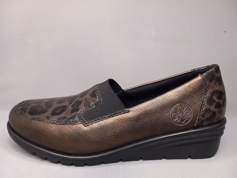 Półbuty wsuwane Rieker L5351-90 klasyczne, uniwersalne i ponad czasowe. W typie mokasynów sprawdzą się do wielu stylizacji. Ciekawy i modny brązowy kolor wpada w oko i wpisuje się w obecne trendy. Wygodna podeszwa stabilna i elastyczna. Buty łatwe w zakładaniu. Świetnie wyprofilowane dzięki zastosowaniu technologi antistress. Delikatny wzór panterki na czubku dodaje charakteru. Fason idealny do spodni i spódnicy.