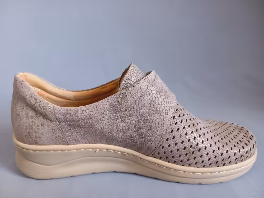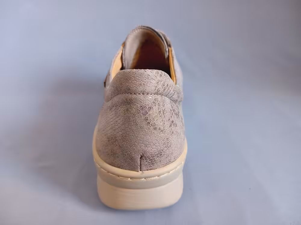 Model został wykonany z naturalnej skóry nubukowej w przyjemnym kolorze beżowym. Cholewka z perforacją poprawiającą cyrkulację powierza. Obuwie posiada profilowane wkładki z możliwością wyjęcia i zastosowania swoich indywidualnych wkładek ortopedycznych. Kształt butów odpowiedni na stopy z haluksami i palcami młotkowatymi. Zapinane na rzep który ułatwia zakładanie i daje większą możliwość swobodnego dopasowania do szerokości. Tęgość H dedykowana na szeroką stopę. Podeszwa grubsza, amortyzuje i chroni przed mikrourazami zapewniając komfort przez wiele godzin. Fason idealny na wiosnę, wpasowuje się w obecne trendy. Delikatnie błyszcząca faktura dodaje uroku. Sprawdzą się na wyjazdy, wycieczki, spacery lub do pracy. Klasyczna forma półbutów jest ponadczasowa i uniwersalna. Regularne czyszczenie i dbanie o buty sprawia, że wyglądają schludnie i służą nam bardzo długo.