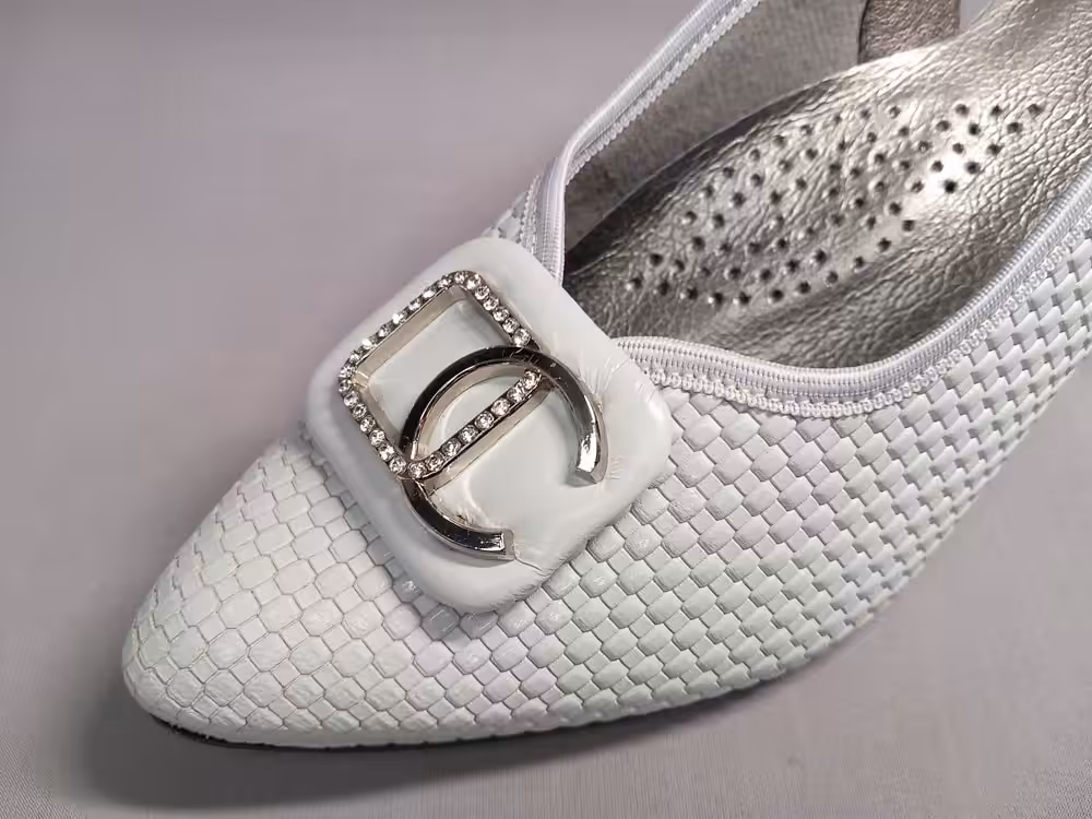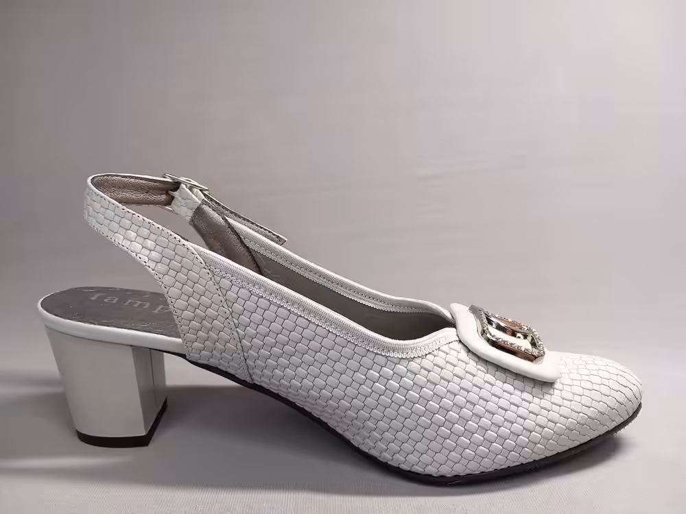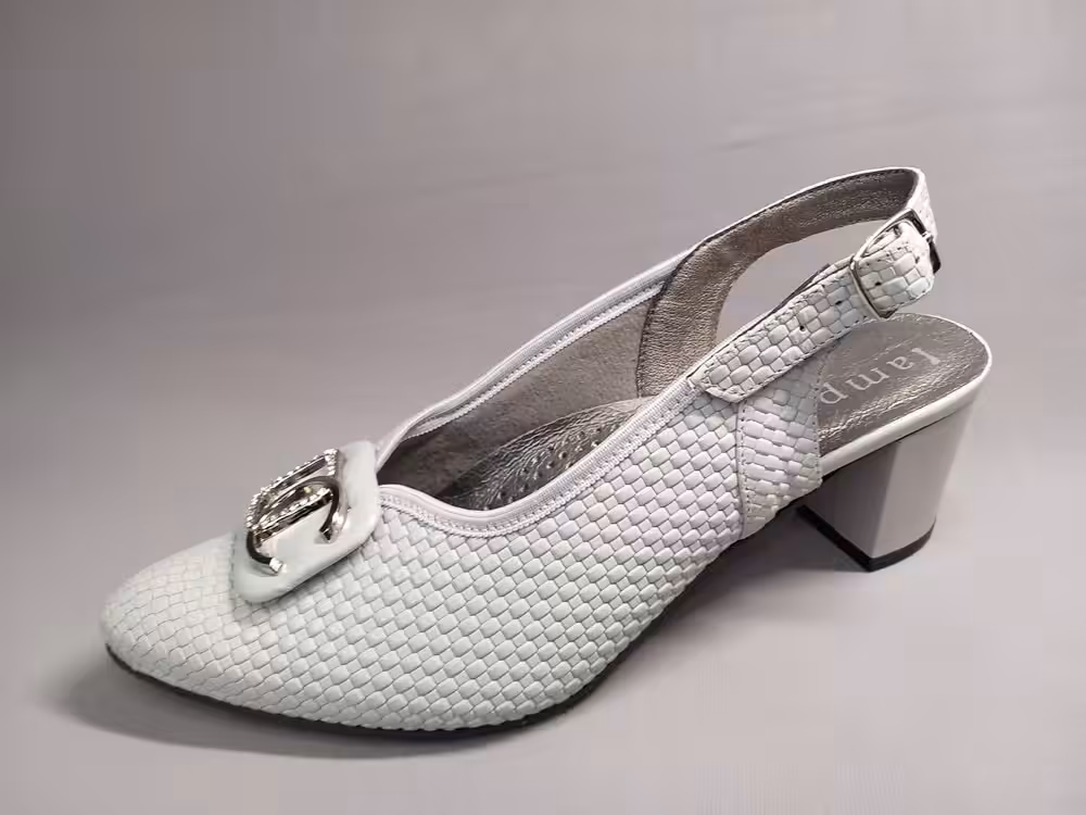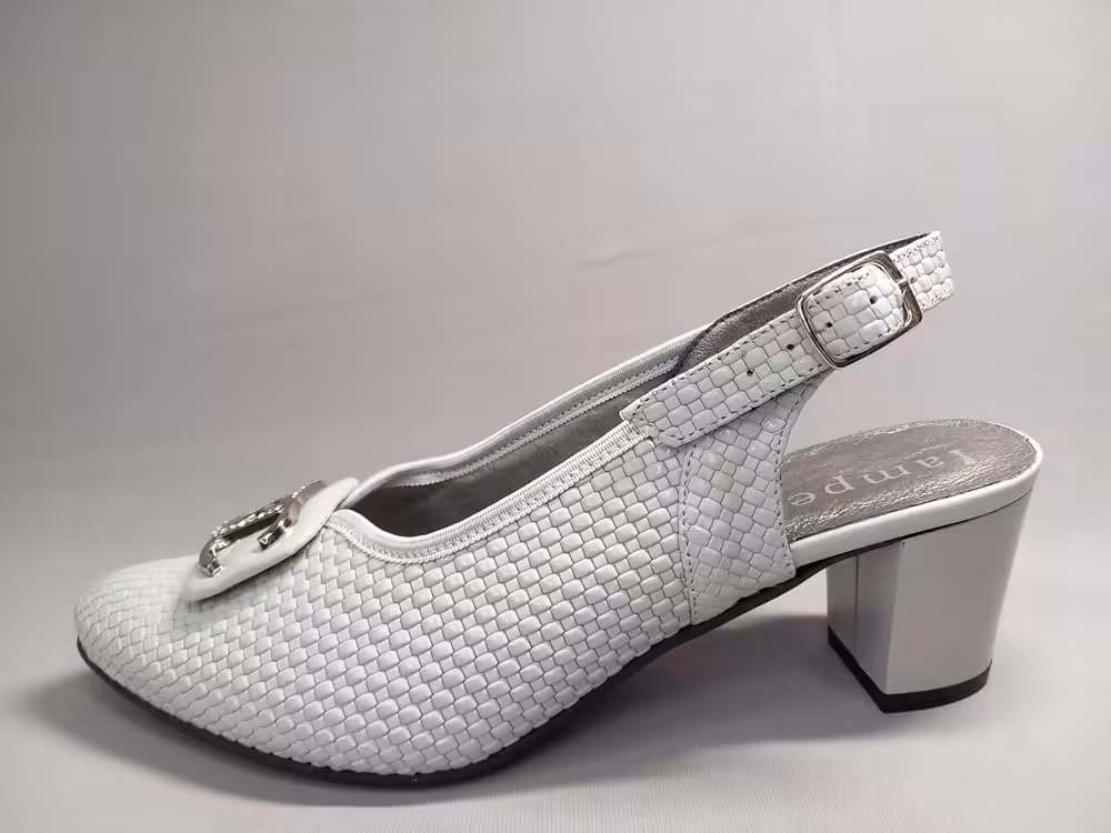 Eleganckie czółenka, sandały damskie idealne na letnie uroczystości. Skóra naturalna licowa o ciekawej plecionej fakturze, przyciąga uwagę i dodaje uroku. Ozdobny biżuteryjny element na przodzie bardzo modny. Obcas stabilny około 5,5cm świetnie się prezentuje. Pasek na pięcie regulowany za pomocą spinki. Nosek w szpic, krój cholewki sprawdzi się również na bardziej wymagające stopy np z haluksami. Jako obuwie wyjściowe i na rodzinne przyjęcia będą świetnym wyborem. Tasiemka która jest wykończeniem ładnie przylega do stopy. Obuwie Polskiej marki Lampert to połączenie dobrego stylu, jakości i wygody. Wnętrze wyścielone miękkim materiałem oddychającym, wkładki delikatnie profilowe, wykonane ze skóry naturalnej.