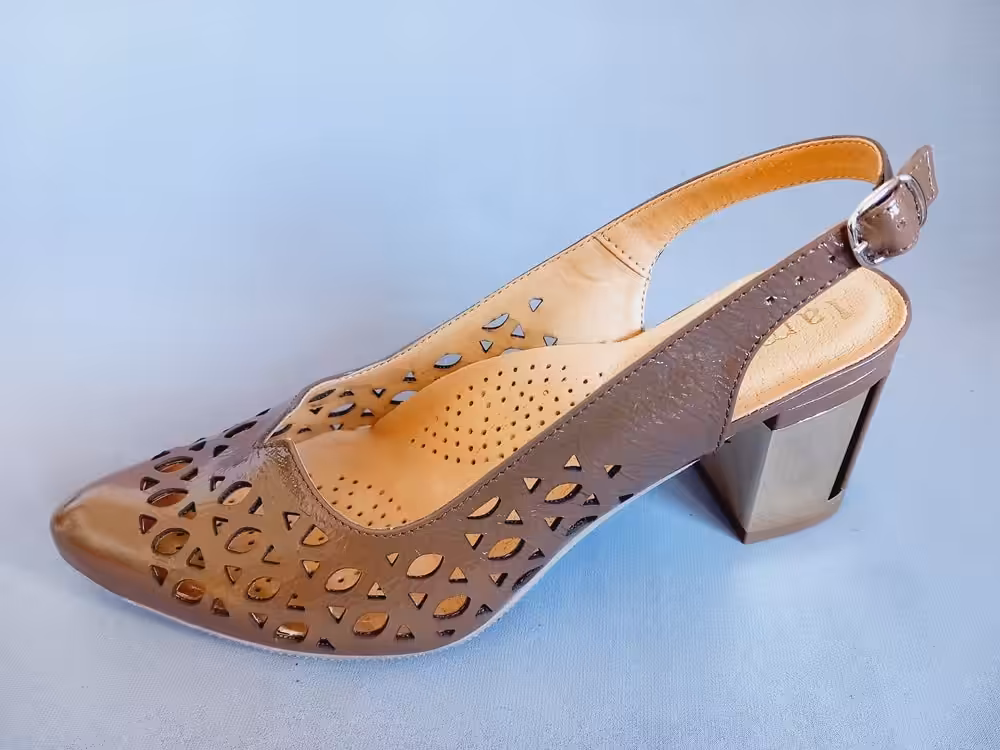 Obuwie wykonane z naturalnej skóry lakierowanej. Wkładki profilowane piankowe, miękkie z wierzchnią warstwą skóry podnoszą komfort użytkowania. Nosek delikatnie zwężany w szpic. Cholewka ażurowa przewiewna ciekawie prezentuje się na stopach. Obcas dość wysoki i stabilny. Pasek na pięcie regulowany zapinany na klamerkę.Obuwie sprawdzi się dla osób szukających komfortu i wygody w eleganckim fasonie. Tęgość obuwia jaką podaje producent to G1/2. Podeszwa pod palcami elastyczna chroniąca przed mikrourazami. Jeśli dbamy o obuwie, regularnie je czyścimy będą służyły nam bardzo długo.