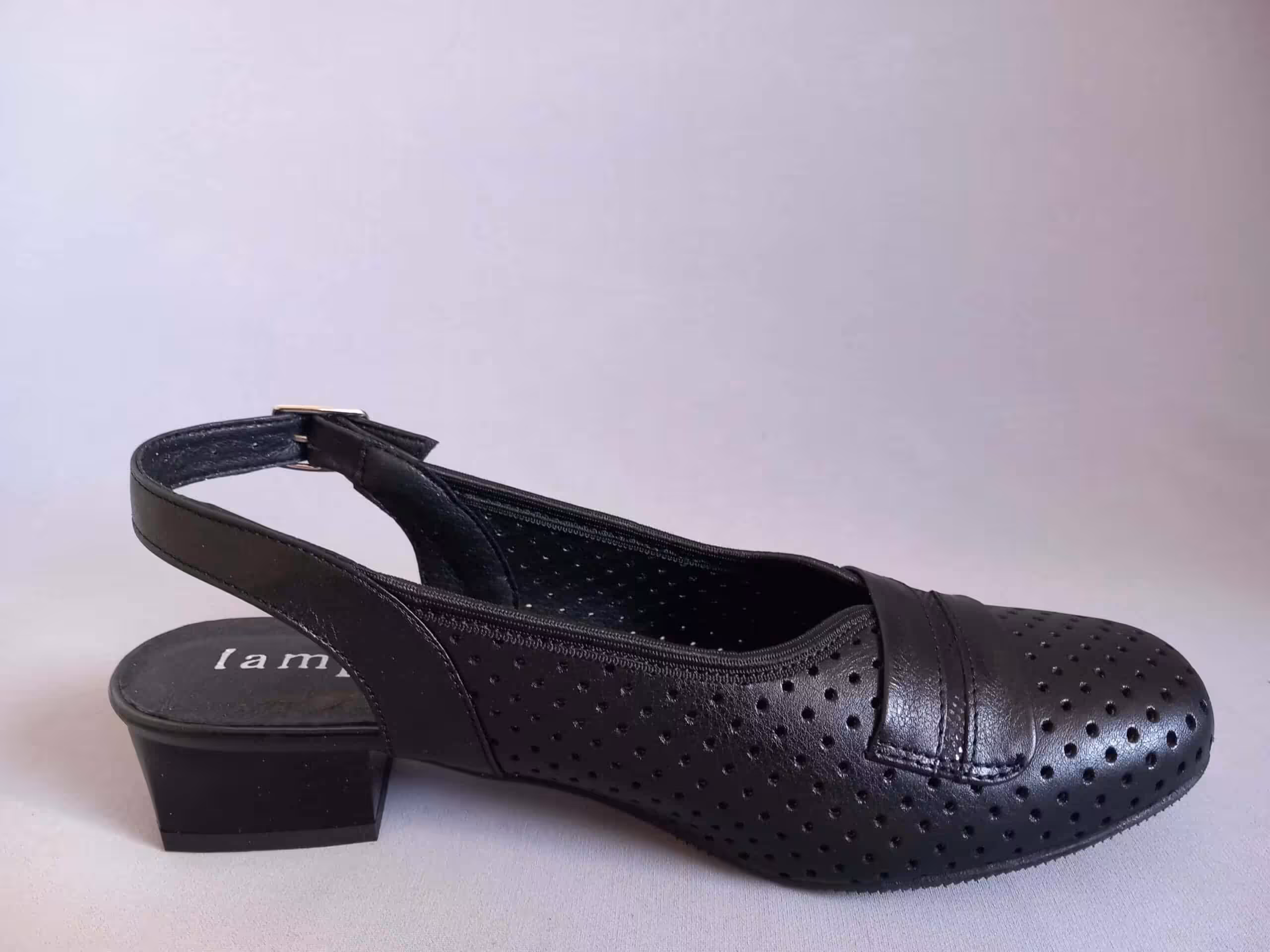Sandały damskie Lampert model 3822923 w kolorze czarnym. Obuwie zostało wykonane z najwyższej jakości skóry naturalnej licowej. Podeszwa typu flex, elastyczna, gumowa z dobrą przyczepnością do podłoża. Obcas stabilny klasyczny średniej wyokość około 3,5cm. Wkładki miękkie profilowane. Cholewka z perforacją aby zapewnić optymalną cyrkulację powietrza. Klasyczny model dostępny w wielu wariantach. Wzór sprawdzi się do wielu stylizacji eleganckich jaki i codziennych. Wzór z zabudowanymi palcami a odkrytą piętą jest najczęściej wybieranym modelem w sezonie wiosna lato. Tęgość H sprawdzi się na szersze stopy z haluksami, odciskami, modzelami i palcami młotkowatymi. Nosek szeroki zapewniający stopie komfort i wygodę podczas użytkowania. Perforacja ciekawie wygląda i poprawia cyrkulację powietrza, Obcas stabilny 3,5cm Profilowana wkładka odciąży zmęczone stopy. Tasiemka przy wykończeniu cholewki ładnie przylega i wysmukla optycznie stopę. Obuwie marki Lampert dostępne w wielu kolorach, z różną wysokością obcasów, wykonane z wielu gatunków skór naturalnych. Produkowane w Polsce, wybierając czółenka sprawdzonych i rekomendowanych firm wspieramy naszą krajową gospodarkę i możemy cieszyć się jakością produktów przez wiele sezonów.