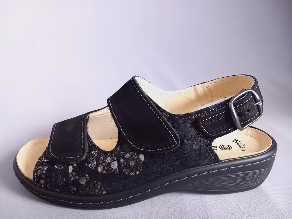 Sandały zdrowotne DrBrinkmann 710116-01 model o cechach obuwia zdrowotnego i profilaktycznego. Dedykowany na szerokie stopy i haluksy. Buty bardzo lekkie z profilowanymi wkładkami na płaskostopie. Dostępne w kolorze czarnym który jest uniwersalny i praktyczny. Sprawdzą się do wielu codziennych aktywności na wrażliwe i chore stopy. Regulacja tęgości za pomocą rzepów.