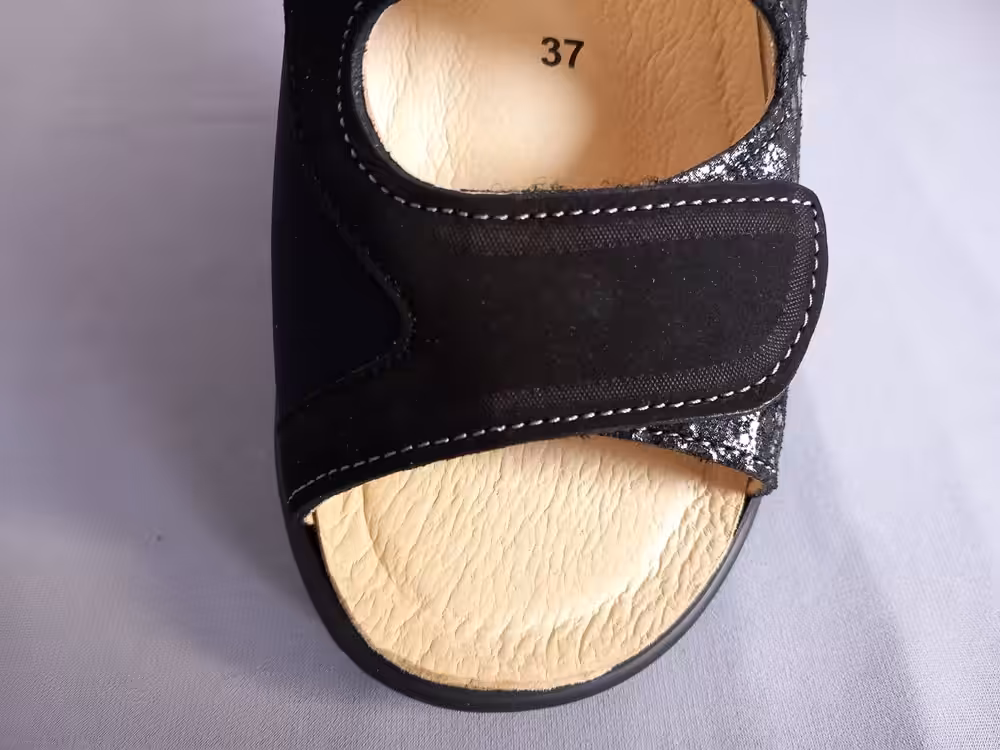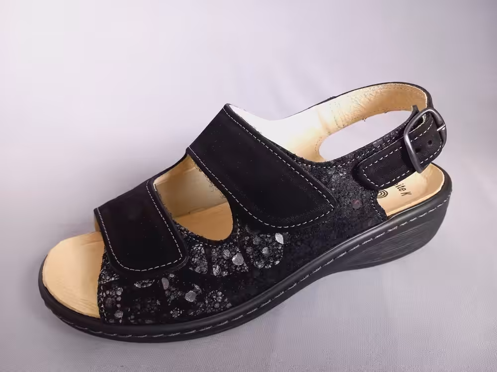 Obuwie wykonane ze skóry naturalnej z wstawkami materiału strecz który dopasuje się do kształtu stopy. Podeszwa grubsza amortyzuje i chroni stopę przed mikrourazami. Dodatkowo stabilizuje piętę i utrzymuje ją w odpowiednim miejscu. Tęgości K szerokość można jeszcze regulować za pomocą rzepów, które są praktycznym rozwiązaniem. Czarny kolor z delikatną błyszczącą wstawką dodającą uroku. Pasek na pięcie regulowany za pomocą klamerki. Wkładki profilowane z możliwością wyjęcia i zastosowania swoich indywidualnych wkładek ortopedycznych. Inwestując w buty wysokiej jakości chodzimy wygodnie i takie wzory będą służyły kilka sezonów. Komfort użytkowania na bardzo wysokim poziomie, a dzięki klasycznej formie modele są ponadczasowe i warto mieć je w swojej szafie.