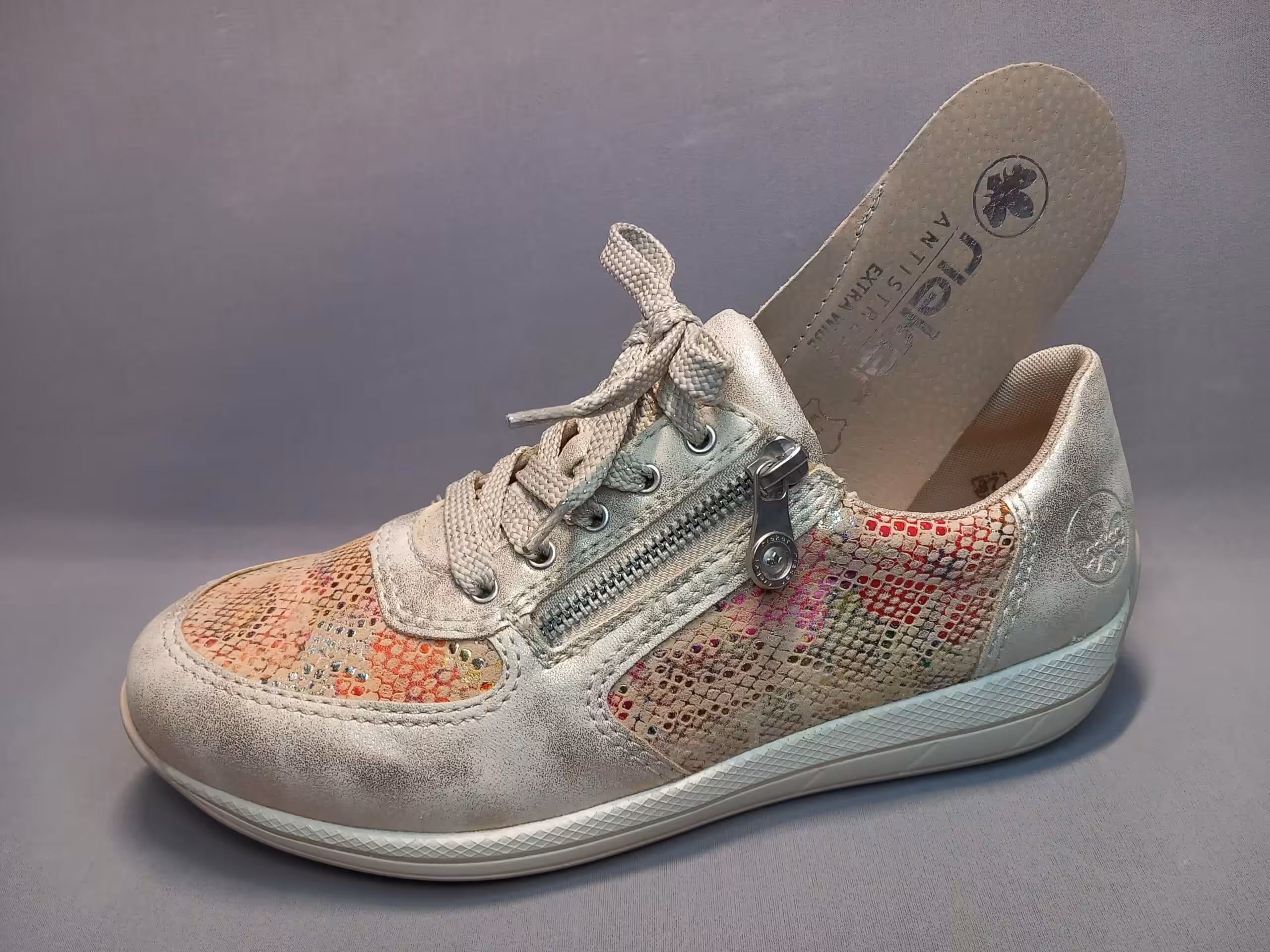 Sneakersy damskie Rieker N1112-91 to sportowy charakter w kobiecej odsłonie. Kolor beżowy z modnymi kolorowymi wstawkami ożywi stylizację. Model bardzo lekki i w większej tęgości zapewni komfort podczas pieszych wędrówek. Sznurówka i dodatkowy funkcjonalny zamek ułatwia zakładanie. Idealne do spodni jak i lżejszych dzianinowych sukienek. Świetnie prezentują się na stopach i sprawdzą się na różne okazje.