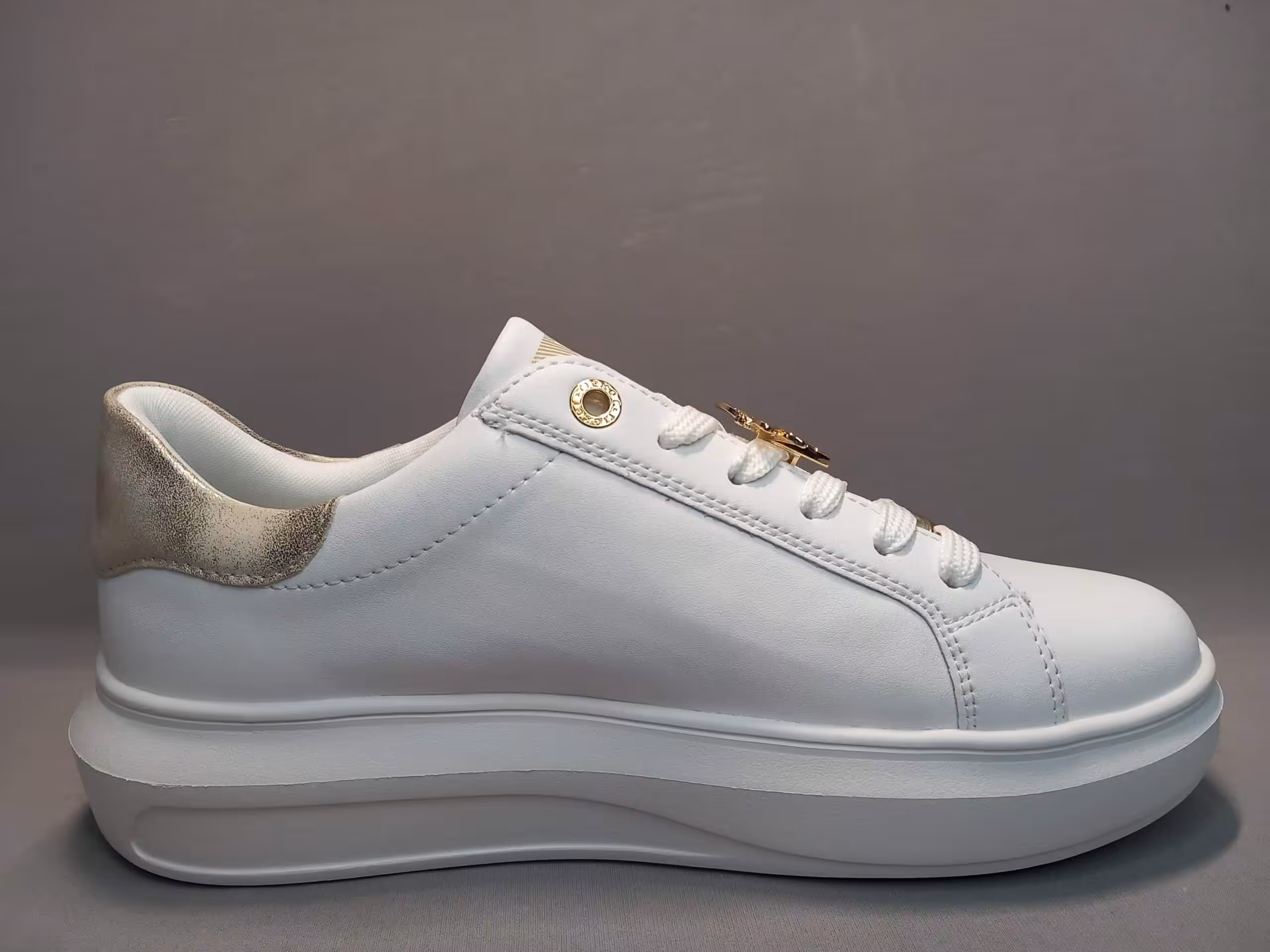 Obuwie zostało wykonane z naturalnej skóry licowej w kolorze białym i złotymi wstawkami. Tęgość G do G1/2 za pomocą sznurówek możemy dowolnie regulować i dopasowywać szerokość do naszych potrzeb. Miękkie wkładki delikatnie profilowane z możliwością wyjęcia i zastosowania własnych wkładek profilowanych. Ozdobna ważka na sznurówce dodaje charakteru, takie dodatki są bardzo modne w tym sezonie. Jeśli nie lubisz takich elementów bez problemu można zdjąć ozdobę z sznurowadeł i zasznurować bez tych ozdób. Wnętrze butów wyścielone miękkim materiałem tekstylnym który dodaje miękkości i komfortu podczas użytkowania. Noski zaokrąglone przez co palce mają więcej miejsca i nie są ściśnięte. Buty w utrzymaniu czystości bardzo łatwe do pielęgnacji możemy użyć pianki i kryjącej pasty w miarę potrzeby.