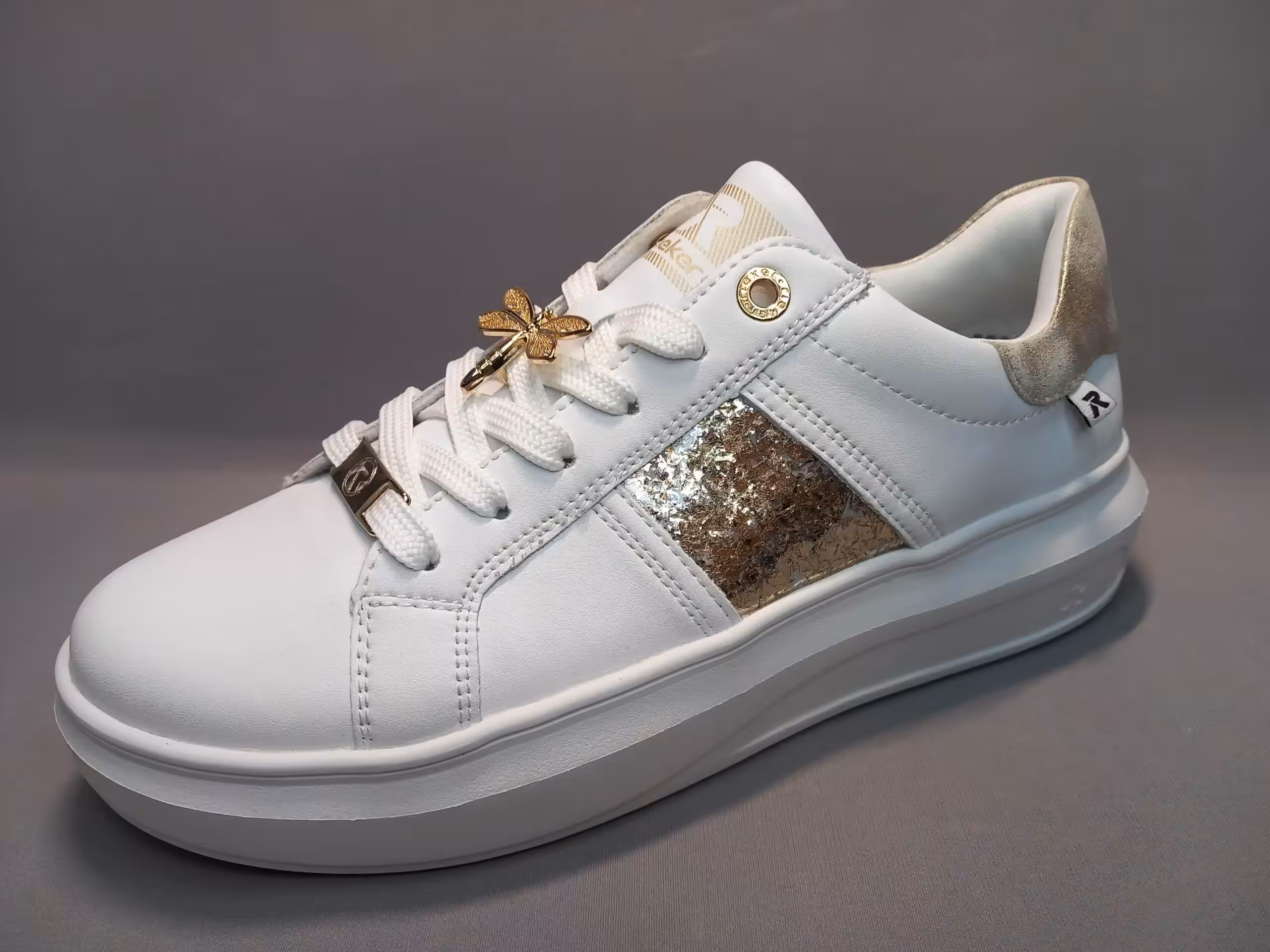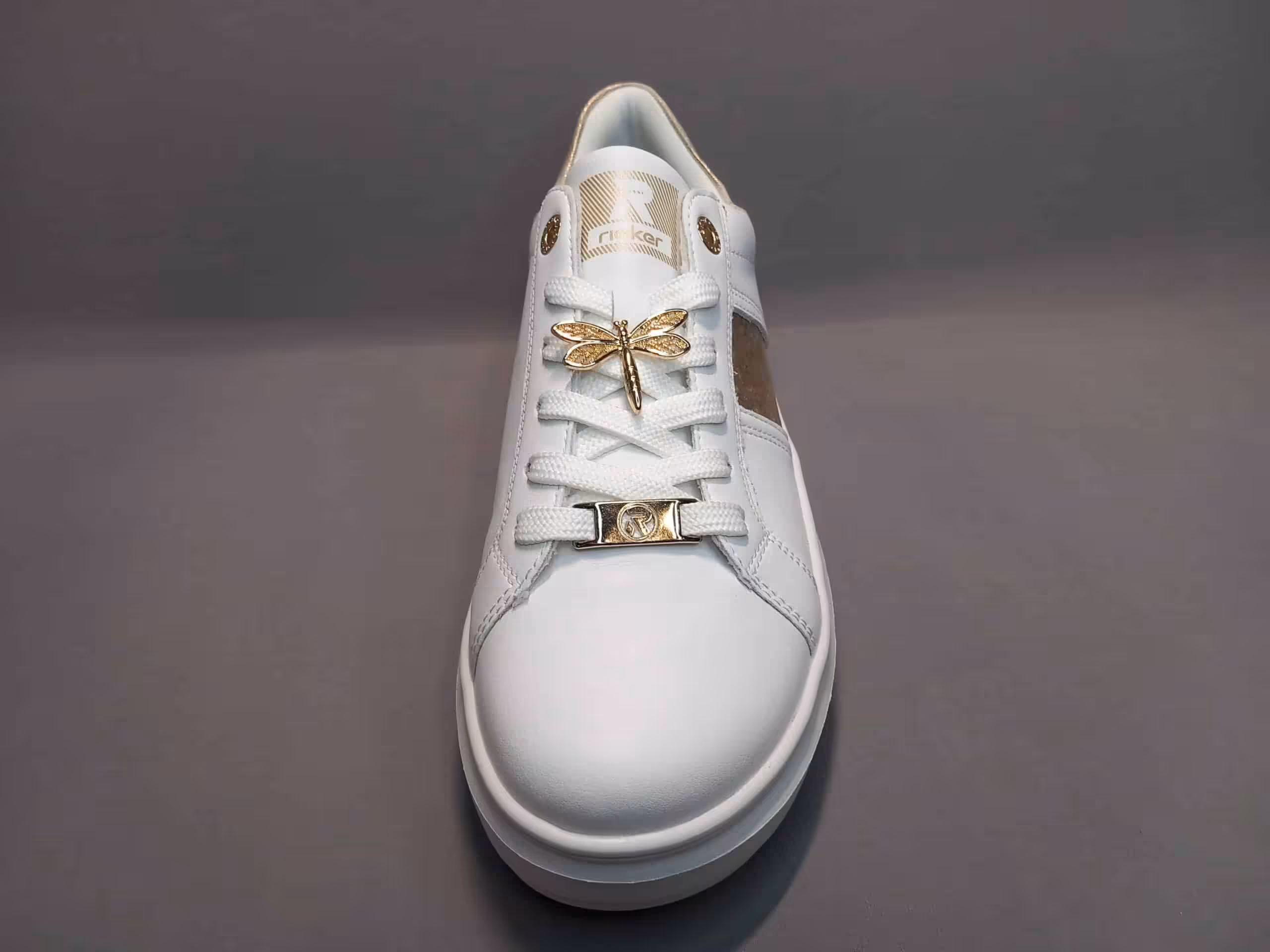 Sneakersy damskie Rieker W1202-82 to ciekawa a zarazem klasyczna propozycja obuwa na sezon wiosna lato. Lekka, gruba podeszwa dodaje komfortu i modnego looku. Biały kolor pasuje do wszystkiego a złote wstawki dodają kobiecości. Ozdobna ważka na sznurówce pełni element dekoracyjny który można w łatwy sposób wyjąć. Sprawdzą się do codziennych stylizacji, do pracy i na spacery. Skóra naturalna łatwa w utrzymaniu czystości.