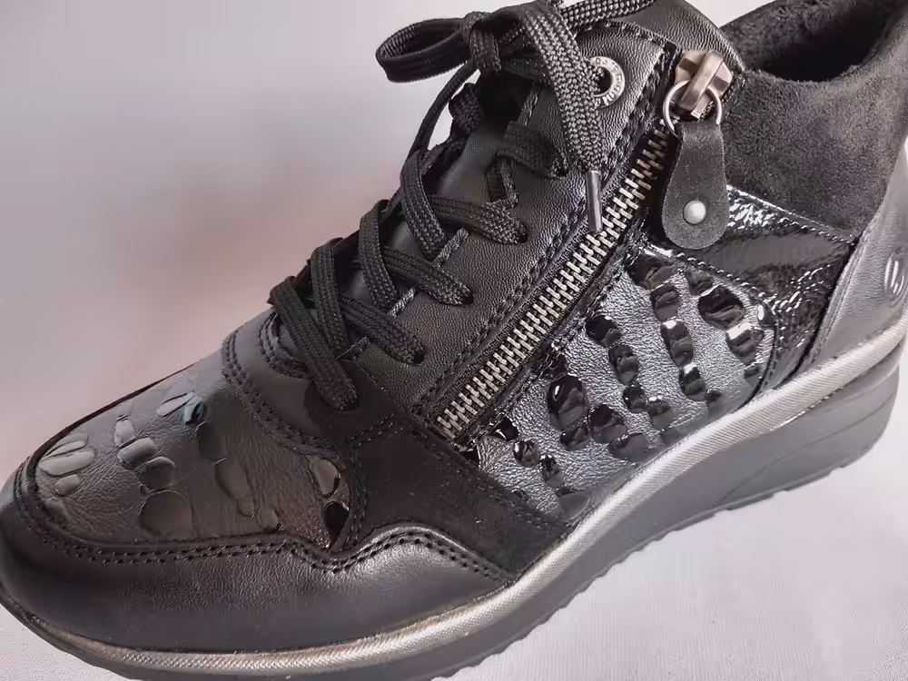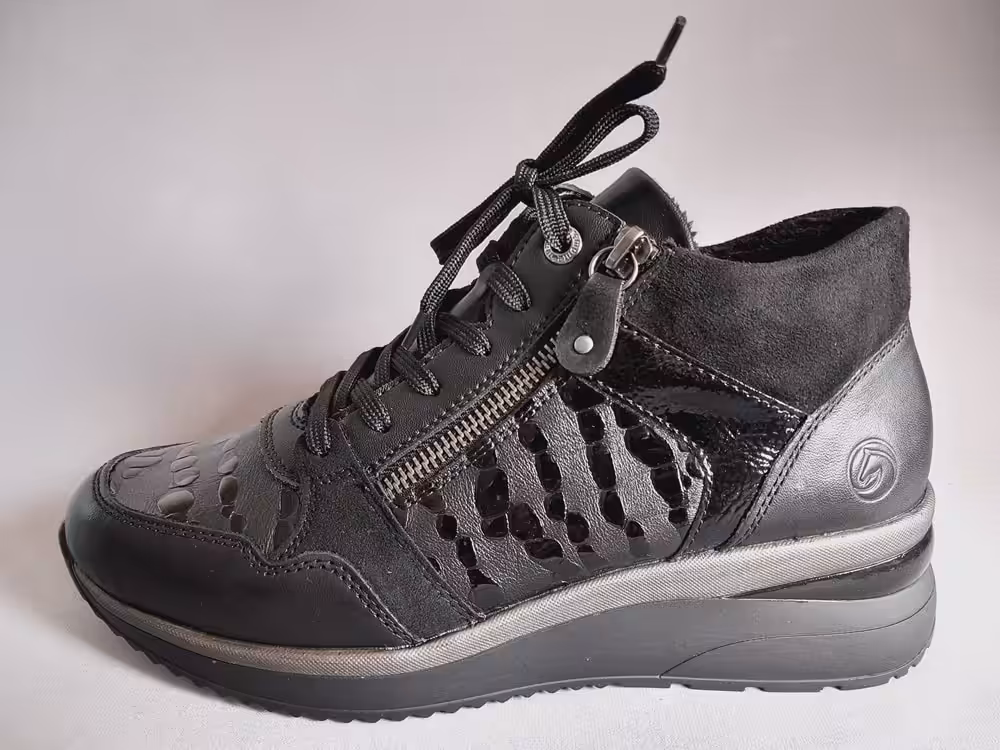 Sneakersy Remonte D2470-03  kolor czarny na sezon jesienno zimowy zawsze jest bezpiecznym i atrakcyjnym wyborem. Wpasuje się do każdej stylizacji. A komfort i wygoda jest zapewniona przez dobre wyprofilowanie i wyważenie całości obuwia. Lekka konstrukcja ciekawy wygląd i ponadczasowość sprawiają, że warto w swojej szafie posiadać choć jedną taką parę obuwia.