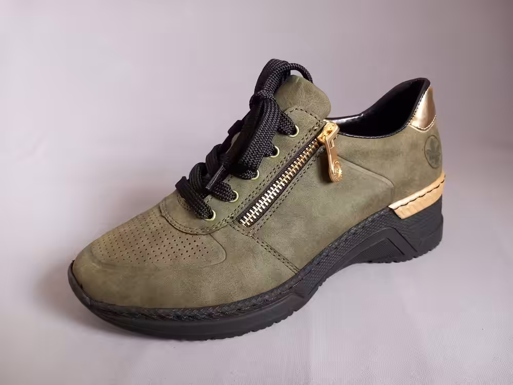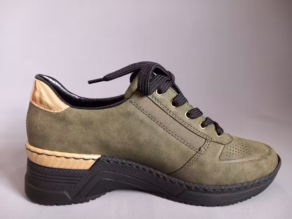 Obuwie marki Rieker idealnie się sprawdza do pracy, jak i na wyjazdy i wycieczki. Tęgość G-H sprawdzą się zarówno na stopy standardowe jak i lekko szersze. Wiązanie i zamek ułatwiający zakładanie. Klin podeszwy 4,5 cm stabilny dodaje nam wysokości. Grubsza podeszwa pod palcami amortyzuje i chroni przed mikro urazami. Model sprawdzi się dla osób z odciskami i modzelami. Marka Rieker dzięki wieloletniemu doświadczeniu w produkcji obuwie, doskonale potrafi łączyć wygodę ze stylem. W obuwiu zastosowano szersze kopyta zapewniając odpowiednią szerokość i stabilizację stopy, podeszwy absorbują wstrząsy oraz odciążają stopy i kręgosłup. Buty bardzo lekkie i trwałe.