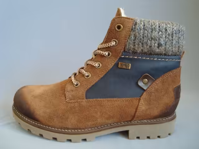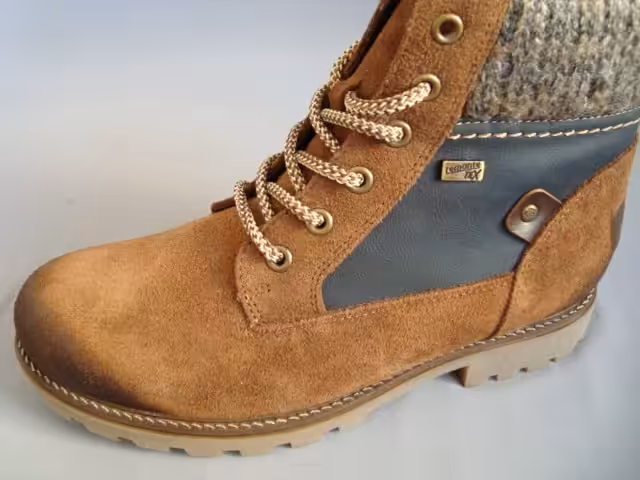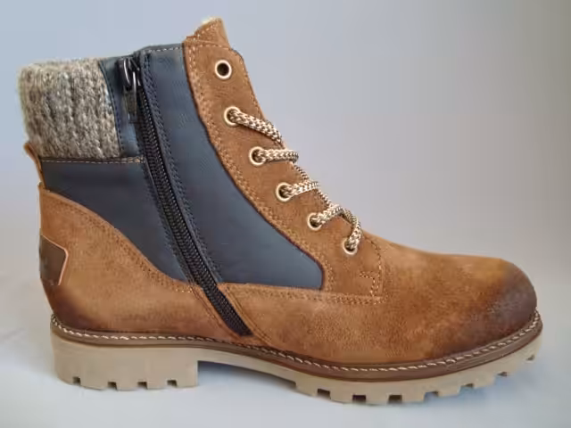 Botki  marki Remonte model D7466-20 w kolorze brązowym. Buty zostały wykonane ze skóry naturalnej zamszowej. Wnętrze ocieplone naturalną owczą wełną. Model wiązany z dodatkowym praktycznym zamkiem tak aby ułatwić zakładanie i dopasowywanie obuwia do stopy. Noski okrągłe dlatego palce mają więcej miejsca i czujemy się bardziej komfortowo. Podeszwa grubsza amortyzuje izoluje przed zimnem i chroni przed mikrourazami. Bardzo modny i pasujący do wielu stylizacji fason. Przód obuwia bez zbędnych szyć dlatego będą odpowiednie na stopy z haluksami. Tęgość G  standardowa. Wkładki delikatnie profilowane z możliwością wyjęcia i zastosowania swoich ortopedycznych wkładek. Podeszwa antypoślizgowa i trwała. Obuwie posiada membranę RemonteTex, wykonaną w technologi gwarantującej zwiększoną wodoodporność. Ciepłe, wnętrze idealne na ujemne temperatury. Zimowe obuwie pasujące do wielu stylizacji zadowolą najbardziej wymagających Panie. Wybór powyższego modelu będzie idealny na chłodne dni jesienno-zimowe. Marka REMONTE dzięki wieloletniemu doświadczeniu w produkcji obuwia,  doskonale potrafi łączyć wygodę ze stylem.
